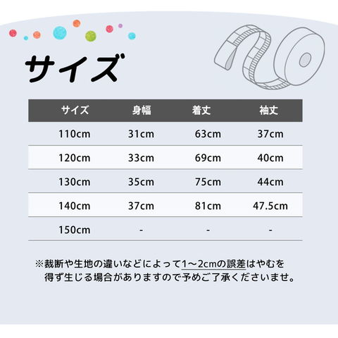 | サイズ | 【110cm】着丈:63cm/身巾:31cm/袖丈:37cm 【120cm】着丈:69cm/身巾:33cm/袖丈:40cm 【130cm】着丈:75cm/身巾:35cm/袖丈:44cm 【140cm】着丈:81cm/身巾:37cm/袖丈:47.5cm |