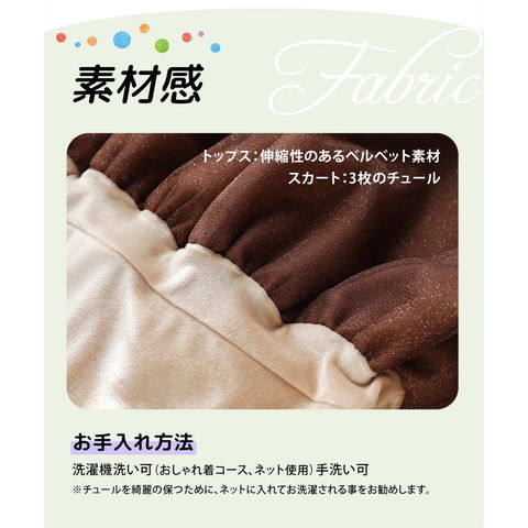| 素材 | 【本体】ポリエステル93%、ポリウレタン7%/【スカート部分表側チュール】ポリエステル70%、ナイロン30% 【内側チュール】ポリエステル100%/【裏側生地】ポリエステル100% |