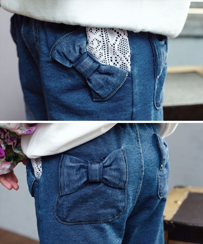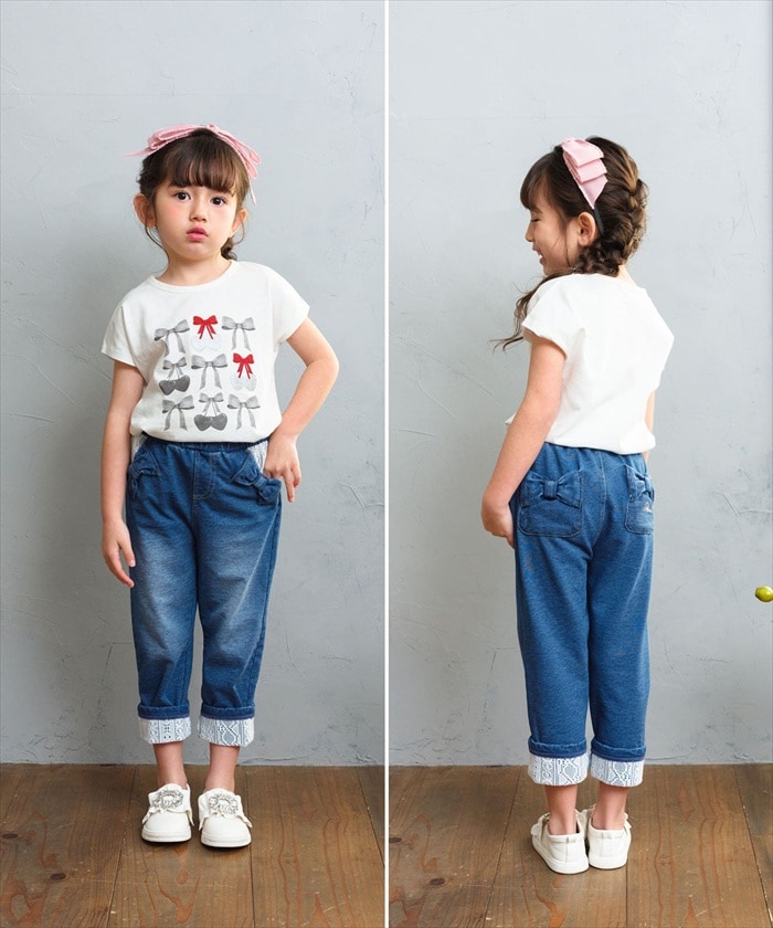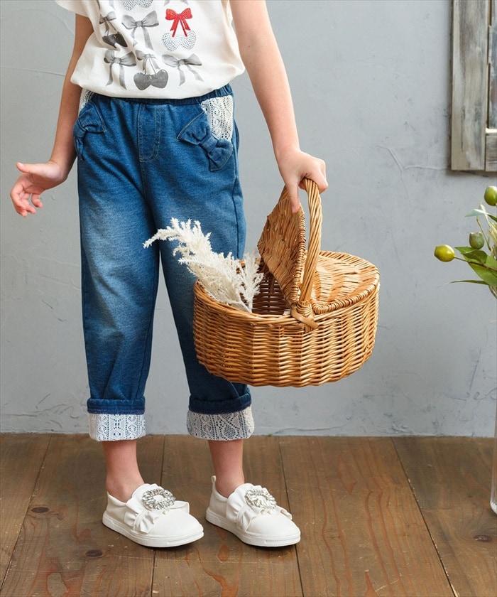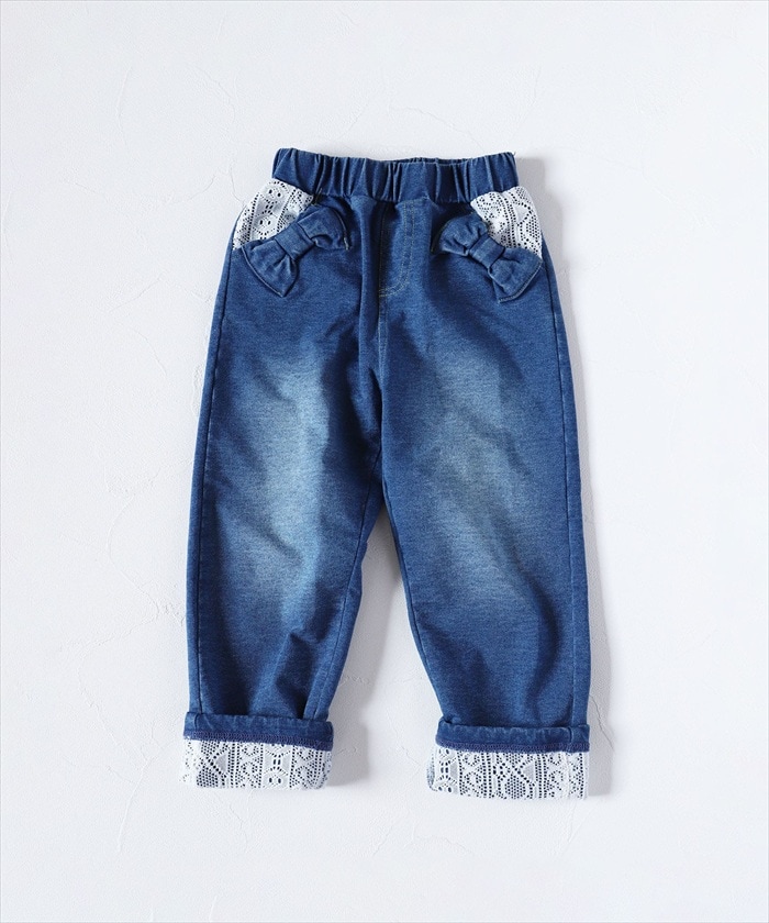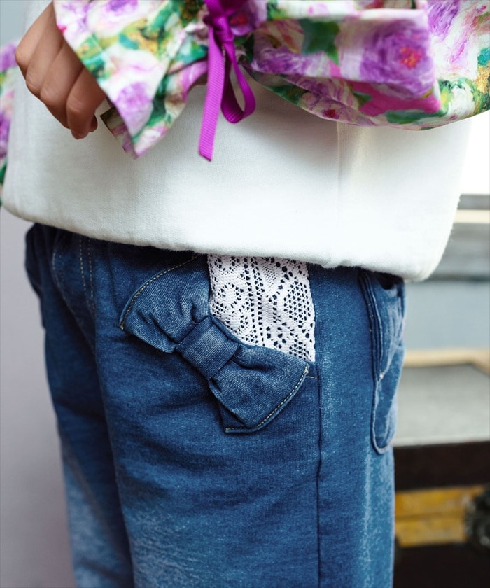 | 商品説明 | 柔らかく履き心地抜群のカットソーデニムパンツは、動きやすさと可愛らしさを兼ね備えた一枚。デニムのカジュアルな雰囲気に、ポケットの大きなリボンとレースのディテールがアクセントとなり、程よい甘さを加えてくれます。裾はロールアップデザインでレースが覗くことでさらに華やかさが増し、カジュアルながらも少しフェミニンな印象を与えてくれます。普段のコーディネートにもぴったりでお子さまの動きを妨げず、活発に遊んでも安心なアイテムです。 |