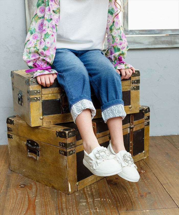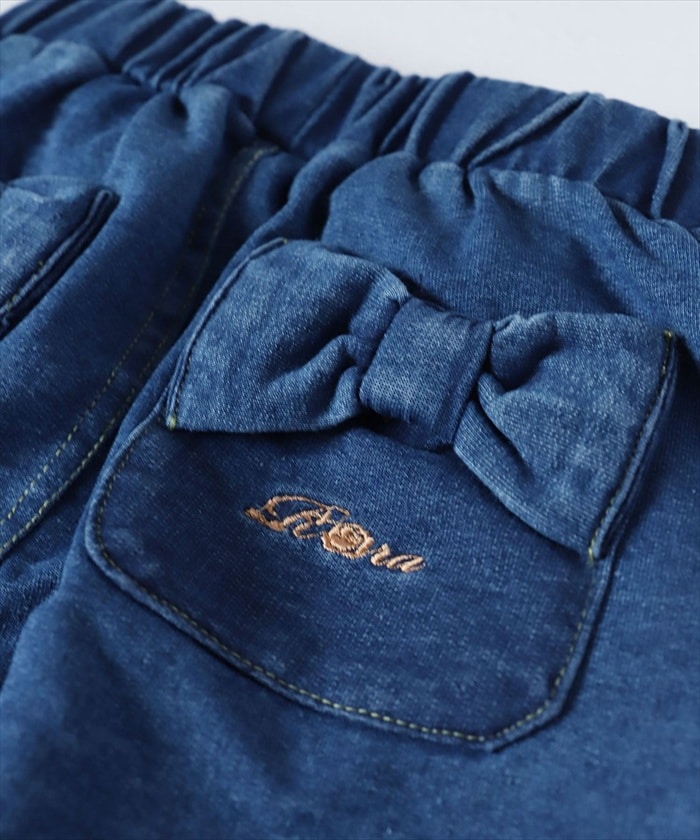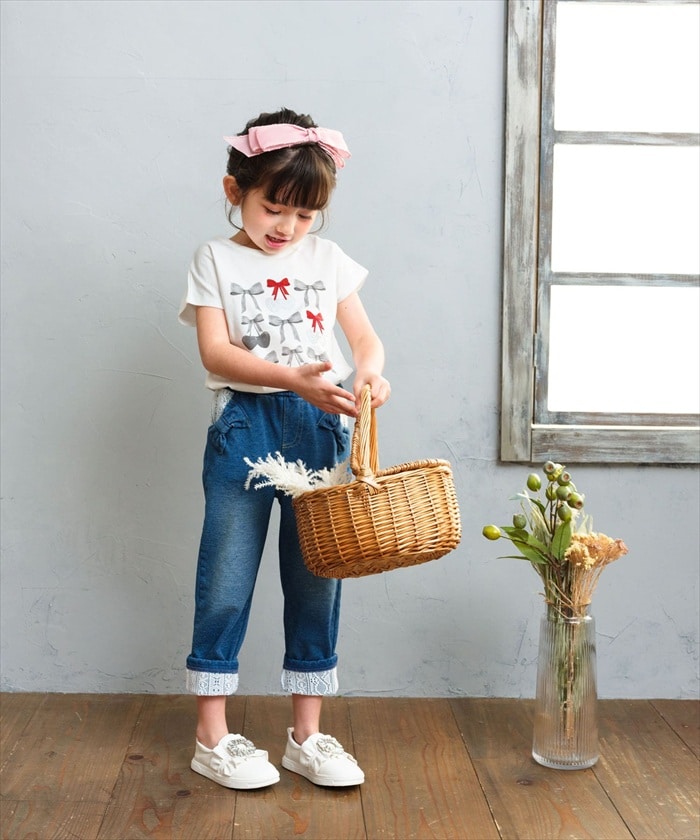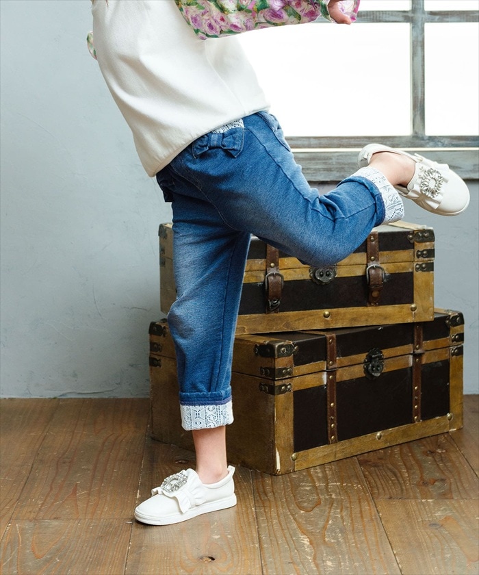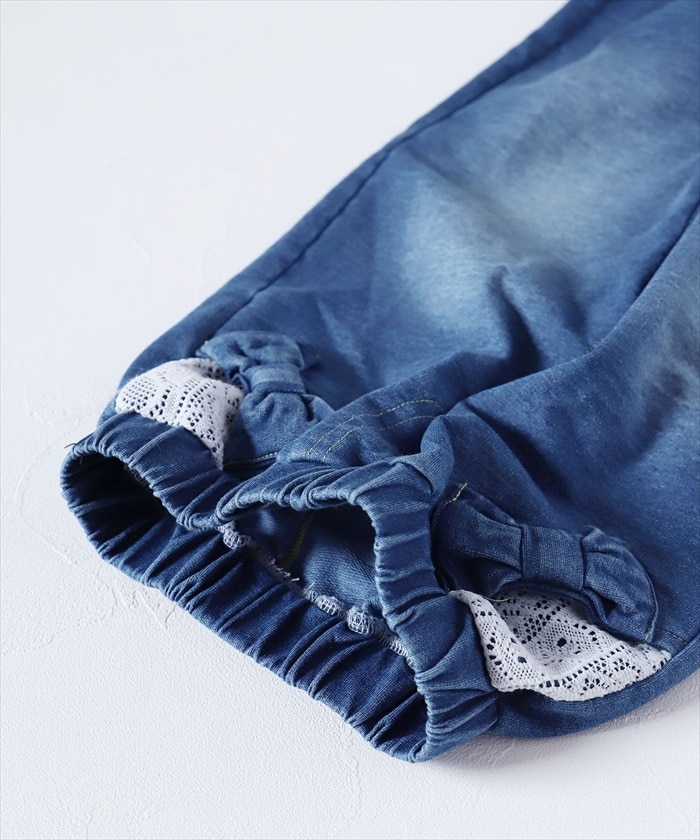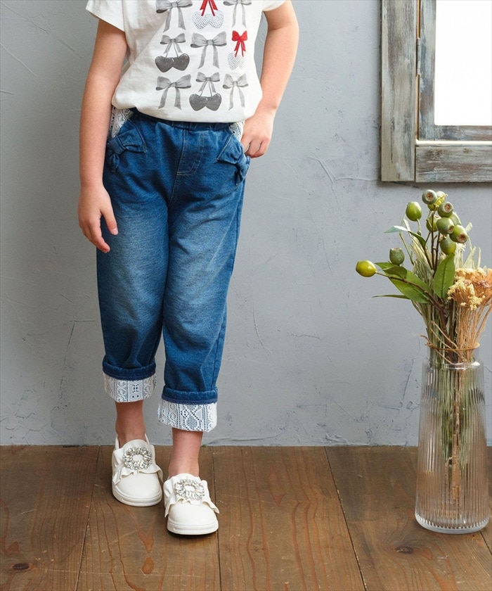 | 商品説明 | 柔らかく履き心地抜群のカットソーデニムパンツは、動きやすさと可愛らしさを兼ね備えた一枚。デニムのカジュアルな雰囲気に、ポケットの大きなリボンとレースのディテールがアクセントとなり、程よい甘さを加えてくれます。裾はロールアップデザインでレースが覗くことでさらに華やかさが増し、カジュアルながらも少しフェミニンな印象を与えてくれます。普段のコーディネートにもぴったりでお子さまの動きを妨げず、活発に遊んでも安心なアイテムです。 |
