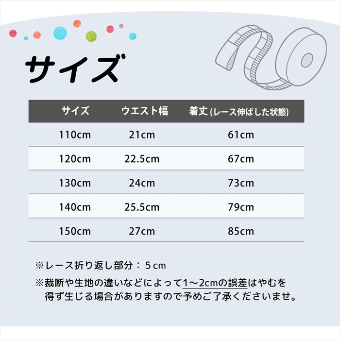 | サイズ | 110cm:[ウエスト1/2]21cm/[レングス(伸ばした状態)]61cm/[レース折り返し部分]5cm 120cm:[ウエスト1/2]22.5cm/[レングス(伸ばした状態)]67cm/[レース折り返し部分]5cm 130cm:[ウエスト1/2]24cm/[レングス(伸ばした状態)]73cm/[レース折り返し部分]5cm 140cm:[ウエスト1/2]25.5cm/[レングス(伸ばした状態)]79cm/[レース折り返し部分]5cm 150cm:[ウエスト1/2]27cm/[レングス(伸ばした状態)]85cm/[レース折り返し部分]5cm |
