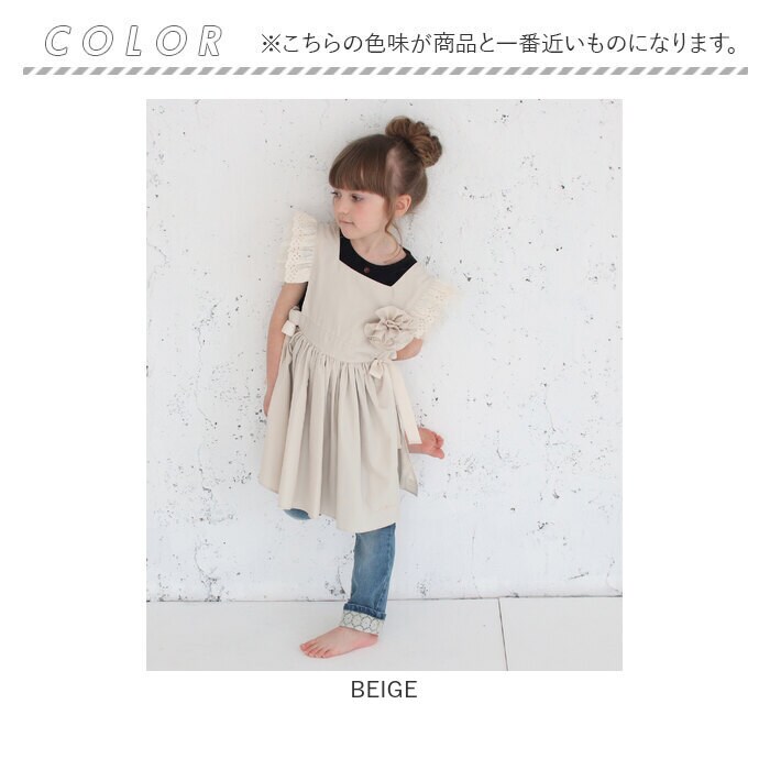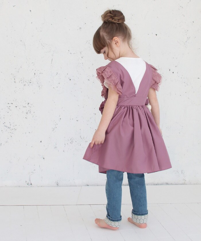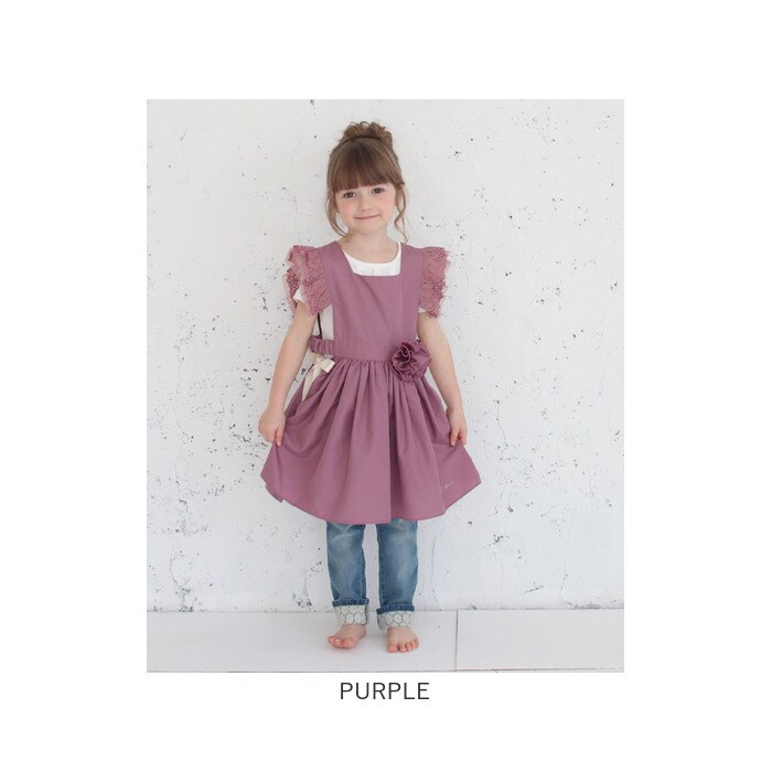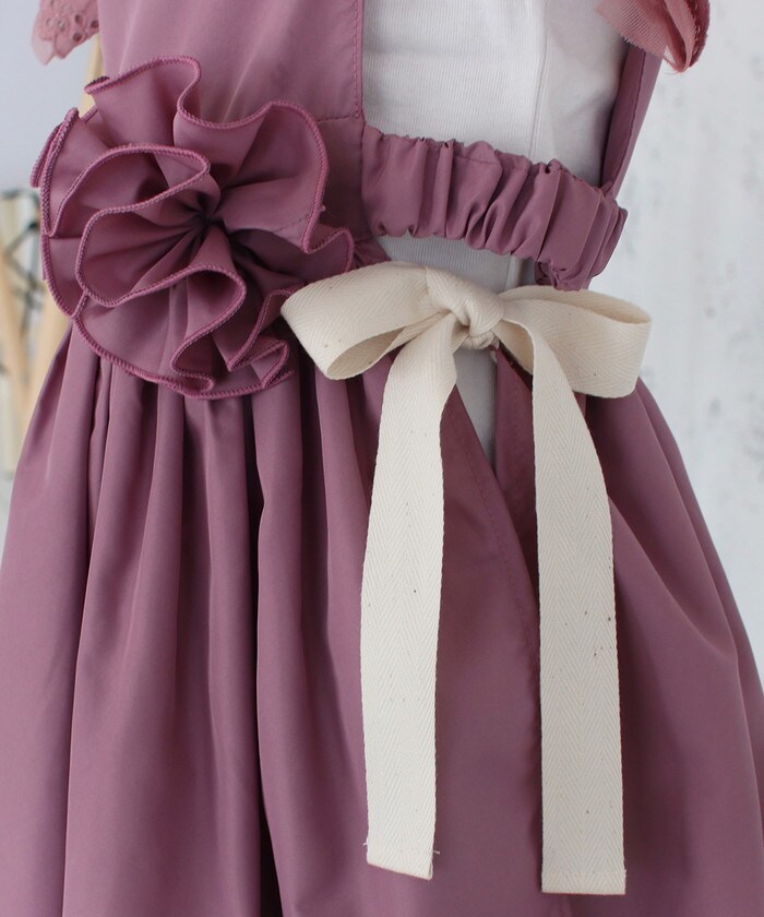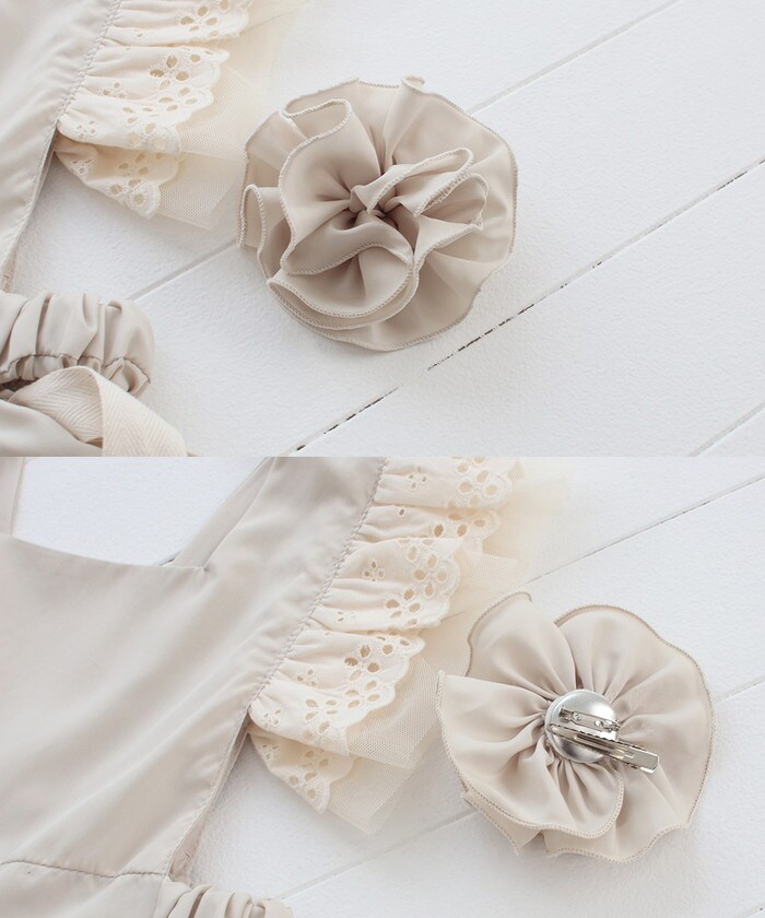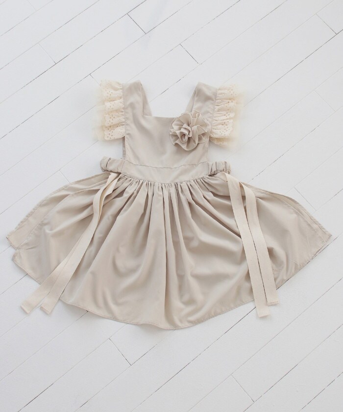 | サイズ | Sサイズ(90~100cm):身幅19cm(フリル下)/着丈52cm Mサイズ(100~110cm):身幅21cm(フリル下)着丈/60cm ※着丈は肩から測っています ※ウエスト部分はゴムが入っています コサージュの大きさ 約10cm(ピンの長さ4cm) |