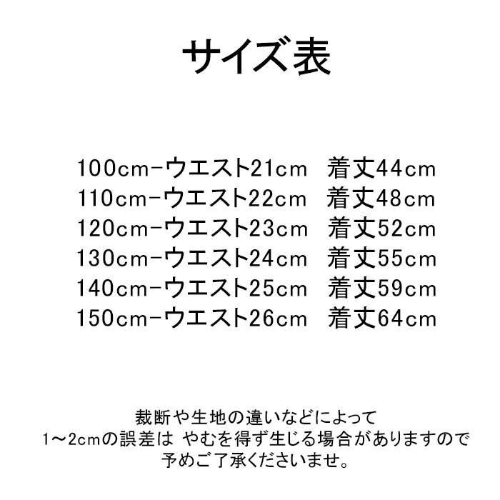 | サイズ | 100cmーウエスト幅21cm着丈42cm 110cmーウエスト幅22cm着丈46cm 120cmーウエスト幅23cm着丈49cm 130cmーウエスト幅24cm着丈53cm 140cmーウエスト幅25cm着丈56cm 150cmーウエスト幅26cm着丈60cm 裁断や生地の違いなどによって1~2cmの誤差はやむを得ず生じる場合がありますので予めご了承くださいませ |