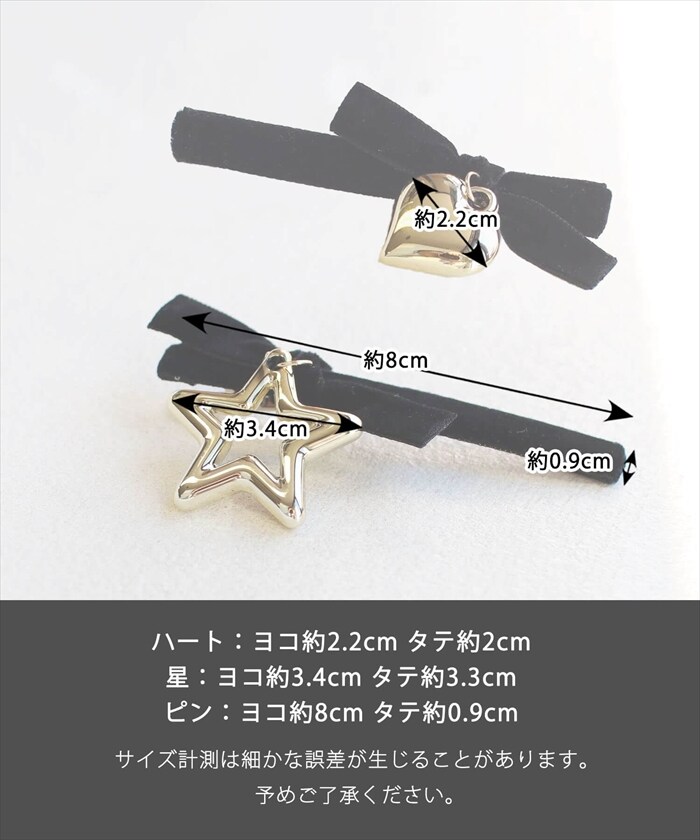 | サイズ | ハートの大きさ:ヨコ約2.2cm/タテ約2cm/星の大きさ:ヨコ約3.4cm タテ約3.3cm/ピンの長さ:約8cm ※サイズ計測は細かな誤差が生じることがあります。 予めご了承ください。 |