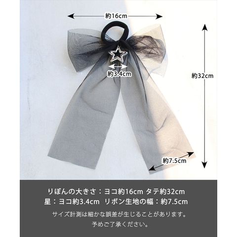 | サイズ | りぼんの大きさ:ヨコ約16cm/タテ約32cm/星の大きさ:ヨコ約3.4cm タテ約3.3cm リボン生地の幅:約7.5cm/ゴムの直径 :約5cm ※サイズ計測は細かな誤差が生じることがあります。 予めご了承ください。 |