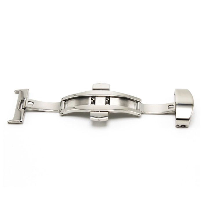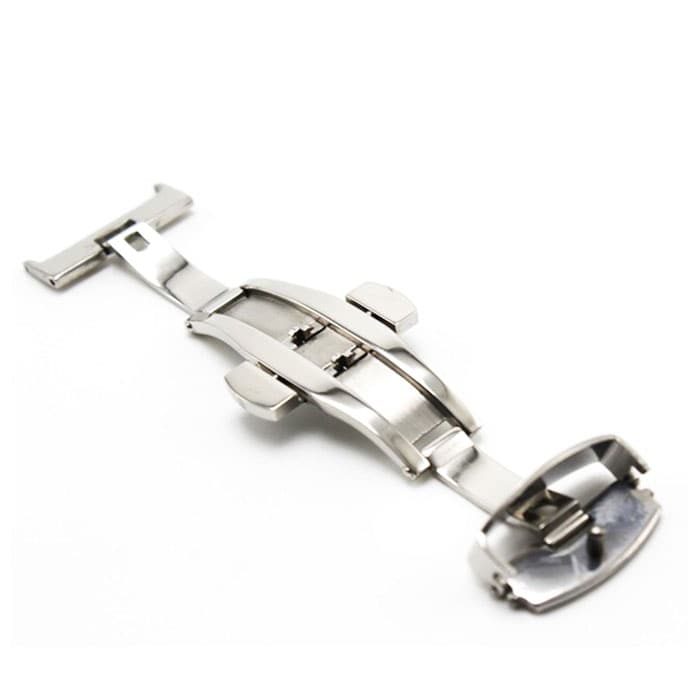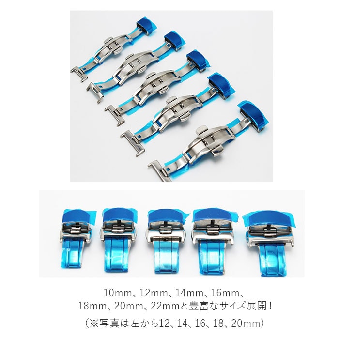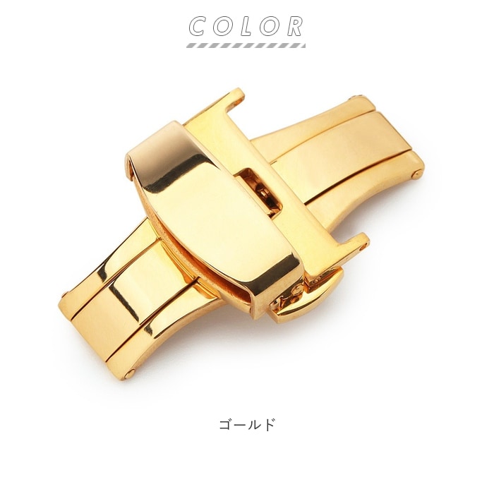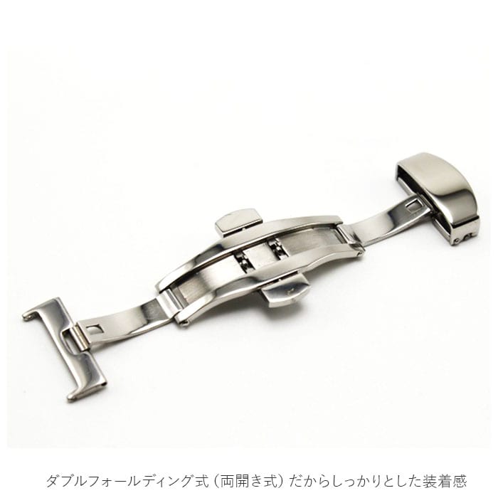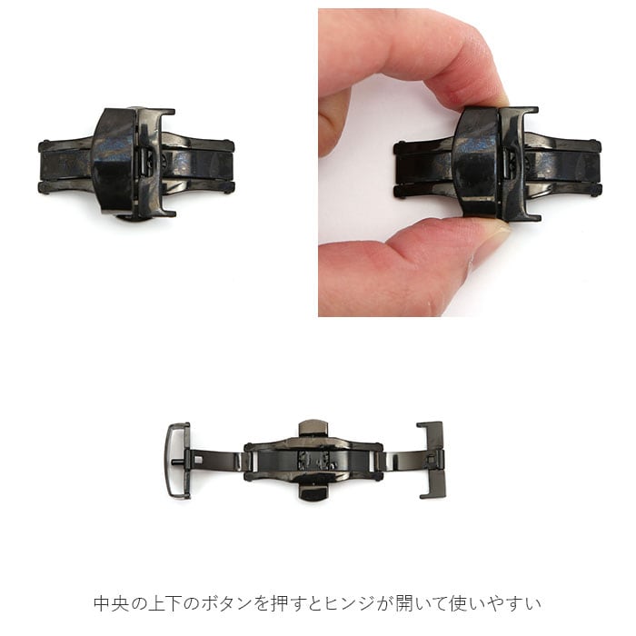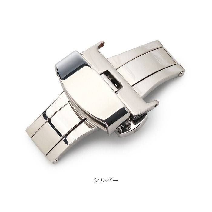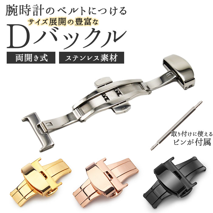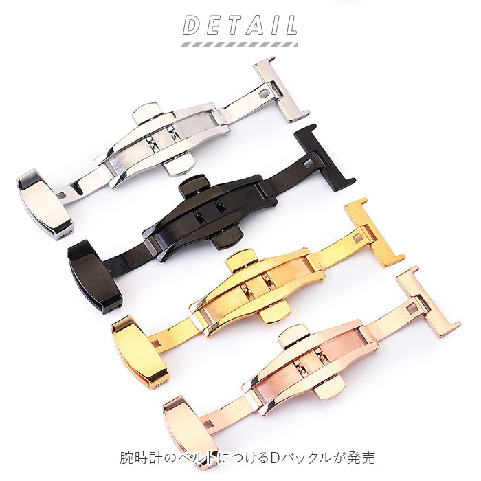 | 商品説明 | 中央の上下のボタンを押すとヒンジが開くタイプで使いやすい◎腕時計のベルトに装着する「Dバックル」が発売。アレルギーが出にくいステンレス素材を使用。金属アレルギーの方や肌が弱い方でも使える♪ダブルフォールディング式(両開き式)だからしっかりとした装着感。お手持ちの時計ベルトの尾錠部分の穴に付属のピンを入れ、片方のバックル穴にピンをさし、お手持ちの工具や指でピンを押し、もう片方のバックル穴に固定。逆側のバックルをベルト穴に合わせる仕様。バックルの金具部分が壊れても自宅で付け替えが可能なのがうれしいポイント。尾錠幅10mm、12mm、14mm、16mm、18mm、20mm、22mmと豊富なサイズ展開! |