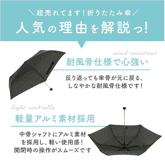 | 商品説明 | 【お天気の急変にも慌てない◎】風に強くパワフル!amusant sous la pluie 耐風折りたたみ傘55cm。【強風などにも負けない耐風構造】風に煽られて反り返っても、傘骨が元に戻る!しなやかな耐風骨仕様の折りたたみ傘。【いつでもどこでもイージーオープン】傘骨をポキポキ折る手間なく、スムーズに開閉できる手開き仕様。【安心・安全のセーフガード機能】爪や指を挟むのを防止するカバーを装備。開閉時のケガを防ぎ、ネイルを施した爪も保護。【軽やかで雨からもしっかりガード】シャフトは軽量なアルミ素材で、開閉時の操作もスムーズ!親骨約55cmと大きめサイズ。【サッとまとまる面ファスナーバンド】傘生地をまとめるバンドは、面ファスナー式。たたむ時も手間取らず、すっきりひとまとめ。【スマートにバッグインOK】傘生地と同じデザインの収納袋付き。サッとまとめて、かさばらずに持ち歩き。【お気に入りを選べるデザイン】大人可愛いデザインをラインナップ!コーデのちょっとしたアクセントに。 |