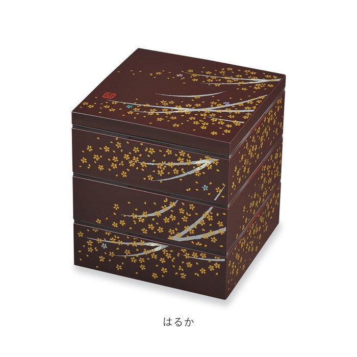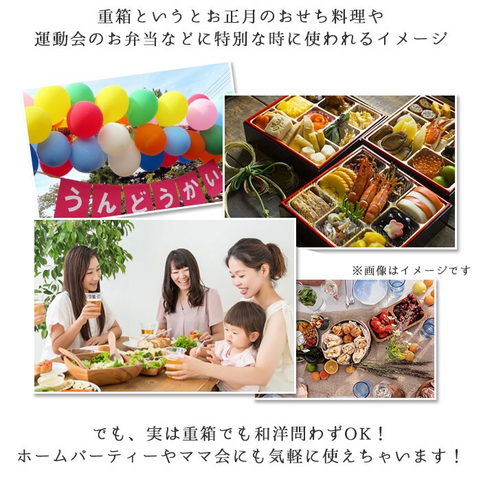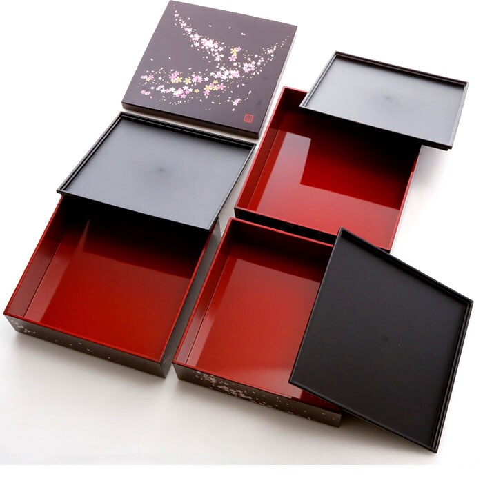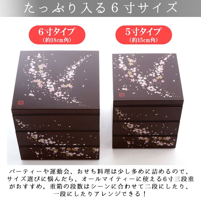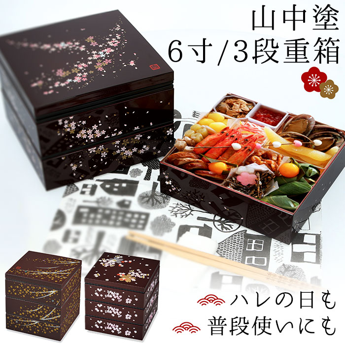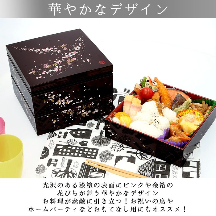 | 商品説明 | 華やかな桜吹雪の塗り模様が漆塗りの表面を彩る、6寸タイプ(約18cm角)のたっぷり三段角重。丈夫で長持ちする樹脂製の素地に、山中塗(やまなかぬり)の塗装を施した高級感のある仕上がり。山中塗とは、伝統ある漆器の生産地、石川県加賀市の山中温泉地区に伝わる伝統的な漆塗の技法。新年におせち料理を囲む時にはもちろん、お花見などの行楽、運動会やピクニックのお弁当の時間にも大活躍。お重一段ごとにシールフタがついているので、汁もれの心配が少なく、取り皿代わりにも使えて便利!シールフタには窪みがあるため、お箸や保冷剤が入れられて使い勝手も抜群!光沢のある漆塗の表面にピンクや金箔の花びらが舞う華やかなデザインで、腕によりをかけたお料理が素敵に引き立つ!お祝いの席やホームパーティなどおもてなし用にもオススメ! |