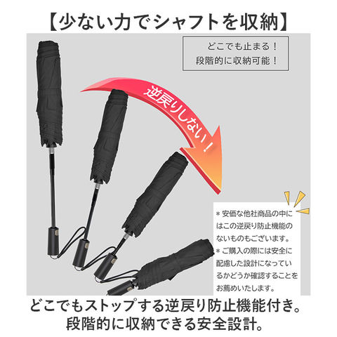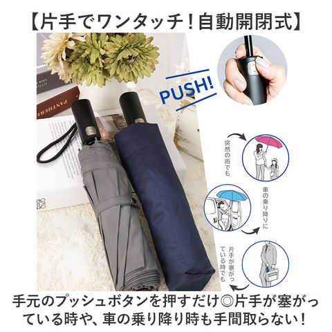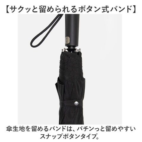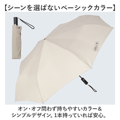 | 商品説明 | 【サッと折りたためてノンストレス】収納がスピーディー!形状安定タイプの「Selfold 自動開閉65cm 8本骨雨傘」。【たたむ動作の煩わしさから解放】特殊な熱加工技術で、生地自体に折り目を。簡単キレイに折りたためる形状安定傘。(※1)半永久的に効果が持続します。【片手でワンタッチ!自動開閉式】手元のプッシュボタンを押すだけ◎片手が塞がっている時や、車の乗り降り時も手間取らない!【少ない力でシャフトを収納】どこでもストップする逆戻り防止機能付き。段階的に収納できる安全設計。【雨粒をサッと弾く超撥水加工】撥水度は最高ランクの5級。雨粒をしっかり弾いて、たたむ時に手元が濡れにくく乾きも速い◎(※2)激しい雨の際は、雨水が染みることがあるのでご注意ください。【直径120cmのビックサイズ】男性でもゆったり、大人2人でも入れるほど大きめのサイズ感。体も荷物も雨からガード。【風が強い日も安心の耐風仕様】親骨の一部は丈夫で折れにくい、グラスファイバー。反り返っても元に戻る耐風傘。【紫外線防止効果で晴れた日も】紫外線から守ることもできる、晴雨兼用傘。夏のお出かけの相棒にも。(※3)雨傘として使うことを主にしたアイテムです。色の濃淡により紫外線遮蔽率が異なります。数値の目安は淡色:約80%、濃色:約90%。【サクッと留められるボタン式バンド】傘生地を留めるバンドは、バチンっと留めやすいスナップボタンタイプ。【握りやすく持ち運びもラクラク】適度な長さのハンドル。手首に通して持ち運べる、便利なストラップ付き。【持ち歩きに便利な収納袋付き】傘生地と同じカラーの収納袋が付属。カバンに忍ばせて、スマートに持ち歩き。【シーンを選ばないベーシックカラー】オン・オフ問わず持ちやすいカラー&シンプルデザイン。1本持っていれば安心。 |