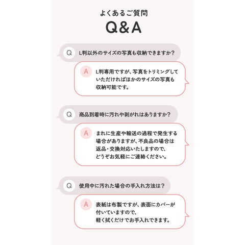 | 素材 | [表紙]布地(透明保護カバー付き) [収納ポケット]ポリプロピレン ※L判写真200枚収納収納可能。 |