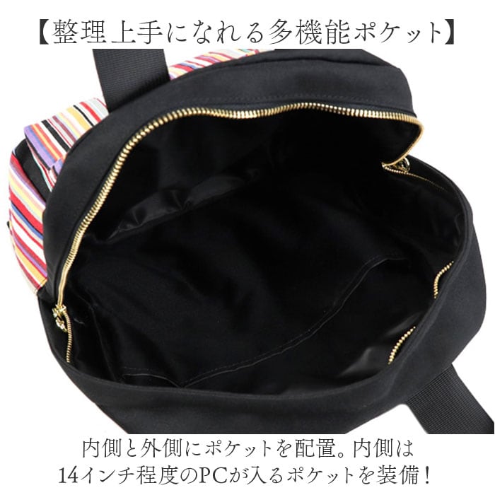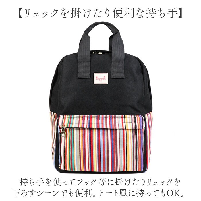 | 商品説明 | 【鮮やかな色彩が魅力】フランス政府認定!老舗メーカーが紡ぐストライプの生地を使った「コンビリュックS」。【レ・トワール・デュ・ソレイユ】・160年を超える歴史を持つテキスタイルメーカーが発信しているブランド。【フランス政府認定の生地】伝統的な製法を用いて紡がれた、フランスらしい配色のストライプの生地は重要文化財に認定。【ガバッと開くダブルファスナー】左右どちらからもオープン。中身を確認しやすく、荷物の出し入れがスムーズ。【A4対応で実用性も◎】深さとマチをしっかり確保。お出かけに必要な荷物をまとめて収納できるサイズ感。【整理上手になれる多機能ポケット】内側と外側にポケットを配置。内側は14インチ程度のPCが入るポケットを装備!【リュックを掛けたり便利な持ち手】持ち手を使ってフック等に掛けたりリュックを下ろすシーンでも便利。トート風に持ってもOK。【カジュアルの中にシックな印象】落ち着きのあるベースカラーにゴールドパーツを使用し、カジュアルさの中にシックさもプラス。 |