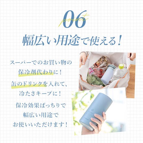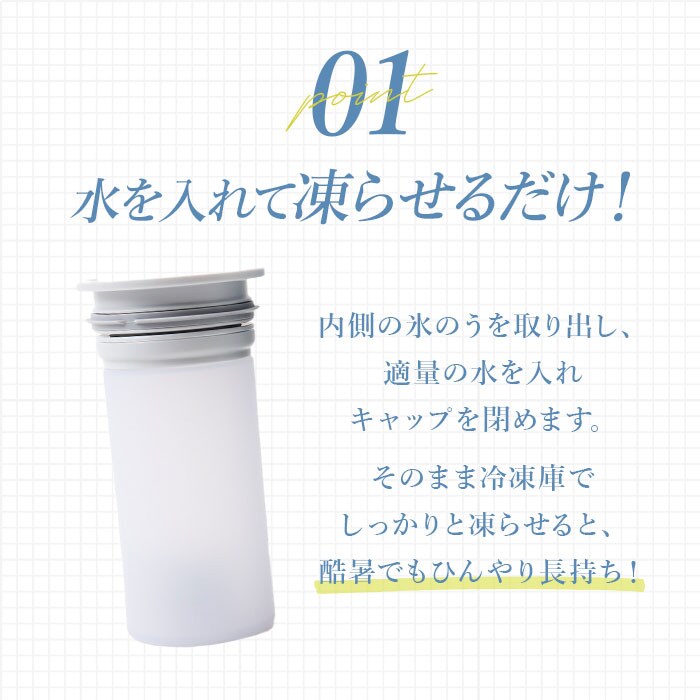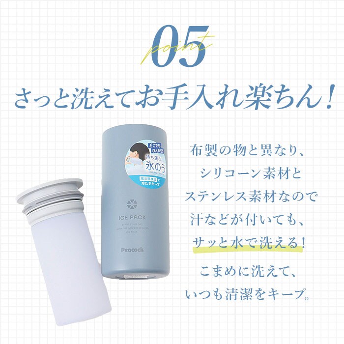 | 商品説明 | 【魔法瓶構造◎持ち運ぶ氷のう】暑い季節の心強い味方!冷たさが長持ちする「Peacock アイスパック」。【アウトドアなど屋外シーンに最適】長時間の外出や屋外レジャー、ゴルフなどにもぴったりなラージサイズ!【水を入れて冷凍庫で凍らせるだけ】シリコーン氷のうに規定量の水を入れ、冷凍庫でしっかり凍らせたら完成。(※1)凍らせたら、冷たさキープホルダーに入れて持ち運んでください。【すぐに使いたい時は氷をIN】シリコーン氷のうに氷または氷水を入れ、冷たさキープホルダーにセット。【真空断熱構造で冷たさキープ】ステンレス製真空二重構造の冷たさキープホルダー。外気熱を遮断し、中の氷が溶けにくい!【肌当たりが優しくポイント使いに】氷のうは柔らかなシリコーン製。お肌を傷つけず、首元や脇など、ピンポイントに冷やせる♪【お手入れもしやすく衛生的】氷のうに汗などが付いても、サッと手洗い可能。こまめに洗えて、いつも清潔。【熱中症対策や熱さましの補助にも】通勤通学や日常生活の中で。発熱時に体に当ててサポート使いや、買い物時の保冷剤代わりに。【保冷缶ホルダーとしても活用】冷たさキープホルダーに缶のドリンクを。結露しにくく、水滴で周囲が濡れずに安心。(※2)500mlサイズ用です。【お気に入りを選べるカラー】どなたでも使いやすいカラーをラインナップ。家族色違い揃えやシェアもOK。 |