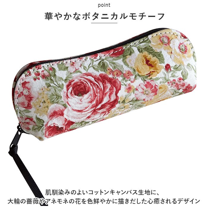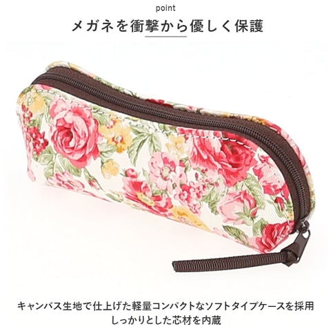 | 商品説明 | 咲き乱れる花々に、こころ華やぐ。軽くてお洒落に持ち歩ける「ROSE -ローズ- メガネケース」が新登場。【華やかなボタニカルモチーフ】肌馴染みのよいコットンキャンバス生地に、大輪の薔薇やアネモネの花を色鮮やかに描きだした心癒されるデザイン。【ファスナーで出し入れスムーズ】ケースの開口部は大きく開くラウンドファスナー仕様なので、メガネの出し入れがスムーズ。リボンをあしらったファスナー引き手がワンポイント。【メガネを優しく保護】キャンバス生地で仕上げた軽量コンパクトなソフトタイプケースを採用。しっかりとした芯材を内蔵しているため、大切なメガネを衝撃から優しく保護。【スリム&コンパクト】カバンやジャケットのポケットの中でもかさばらないコンパクトなフォルムで、持ち運びに便利。【Made in Japanファブリック】花柄を散りばめた生地ぶは、上品な日本製ファブリックを使用。身の回りの小物は見た目にも品質もこだわりたい方にオススメ。【使い方いろいろ】メガネケースとしてだけでなく、小ぶりなコスメポーチやペンポーチ、イヤホンやモバイル小物用ケースなど、使い方はアイディア次第で無限大。 |