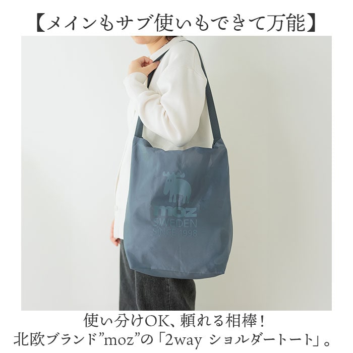 | 商品説明 | 【メインもサブ使いもできて万能】使い分けOK、頼れる相棒!北欧ブランド”moz”の「2way ショルダートート」。【いつでもバッグインできる軽量設計】とっても軽い薄素材。畳んでバッグに入れておけば、荷物が増えた時のサブバッグとして活躍。【お好みに合わせてスタイルチェンジ】長いハンドルを使ってショルダーバッグ。短いハンドルを使ってトートバッグにもなる2WAY。【どこでもスムーズに開閉できて便利】ひと手間をなくしたオープン開口。ガバっと開いて、移動中もサクッと取り出し。【A4対応でデイリー使いに最適】A4がすっぽり。程よくマチを設け、ペットボトルやポーチなども収まるサイズ感。【サクッと取り出せて迷子知らず】内側にポケットを1つ配置。細々した物も、バッグの中で探す手間が不要。【主張しすぎないナチュラルデザイン】フロントに大きめのロゴプリントを入れつつ、コーデに馴染む落ち着いたカラーリングが魅力☆【ポケット仕様】内側:オープンポケット×1 |