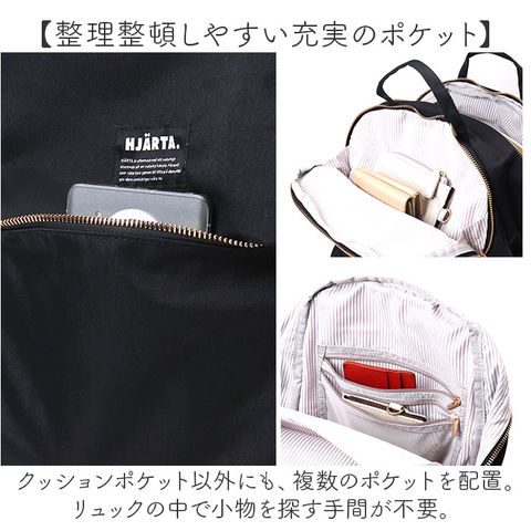 | 商品説明 | 【お出かけの頼れる相棒に☆】スマートに見えて、しっかり収納◎気軽に持ち出せる「HJARTA リュック」が新登場。【スリムで無駄のないデザインが魅力】荷物をすっきりまとめて、人混みでも邪魔になりにくい!色んなシーンで使えて万能。【ガバっと開くダブルファスナー】左右どちらからもオープン!取り出しやすく、ファスナーを閉じればセキュリティ面も安心。【A4対応◎通勤・通学にも最適】A4サイズがすっぽり。ノートPCが入るポケットを装備し、クッション材入りで衝撃をガード。【整理整頓しやすい充実のポケット】クッションポケット以外にも、複数のポケットを配置。リュックの中で小物を探す手間が不要。【負担をかけず背負い心地快適】ショルダーにはクッション性をプラス。肩に食い込みにくく、ストレスフリー◎【ラフなスタイルに素敵にマッチ】シンプルなワンカラーに、フロントロゴや内生地がアクセント。カジュアル感のある仕上がり☆【HJARTA-ヤッタ-】テキスタイルデザイナー吉澤葵さんが描いた、温かみのあるアートを使用。(※)スウェーデン、フェンランドで活躍しているデザイナーさんです。【ポケット仕様】内側:クッションポケット×1、ファスナーポケット×1、ファスナー式メッシュポケット×1、ボトルポケット×1(メッシュ&上ゴム仕様)前面:ファスナーポケット×2サイド:オープンポケット×2(ゴム仕様) |