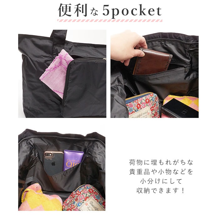 | 商品説明 | 大容量で色々入ります。全部で5つのポケットで、小分け収納が楽にできます。折り畳んで外側前面のポケットに収納するとコンパクトになり、軽量なので持ち歩きに便利なバッグです。 |