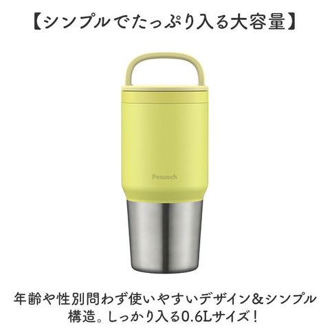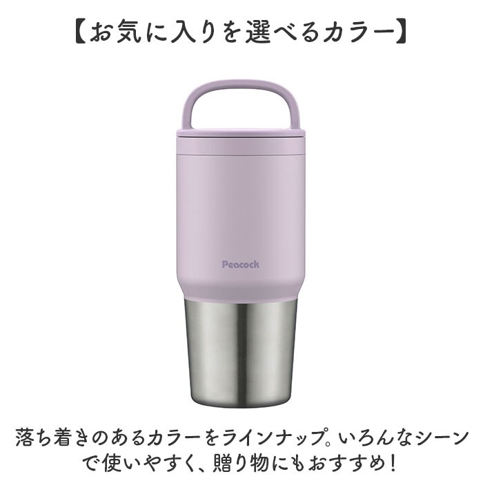| 商品説明 | 【毎日使いたい!機能的な相棒】洗いやすさ・持ち運びやすさ・飲み心地の良さにこだわったPeacock ステンレスボトル。【シンプルでたっぷり入る大容量】年齢や性別問わず使いやすいデザイン&シンプル構造。しっかり入る0.6Lサイズ!【保温保冷両用でオールシーズン活躍】本体内側と外側が真空断熱された、ステンレス2重構造タイプ。温冷共に飲み頃温度をキープ。(※)フタには断熱材を使用しております。【サッと水分補給できるスクリュー式】フタを回すだけで開けられるスクリュー式。いつでもどこでも、ゴクゴク直飲みOK。【アイスもホットも飲みやすさを追及】氷が飛び出す心配がなく、中身が一気に流れ出ない氷止め付きの飲み口。小さなストレスを軽減。【幅広口径のラク洗いボトル】奥まですっぽり手が入る、約7.7cmの口径。氷やドリンクを入れやすく、準備がスムーズ。【食洗機対応でお手入れカンタン】少ないパーツ&パッキンは取り外せるつくり。全パーツ食洗機使用可能で、忙しい毎日の味方☆【ドリンクホルダーにも入れやすい】自動車などのホルダーにも入れやすい、段差のある形状。ドライブのお供にも♪【手に取りやすく持ち運びも楽々】フタの上部にはハンドル付き。幅をゆったりと確保し、スマートに手持ち移動。【お気に入りを選べるカラー】落ち着きのあるカラーをラインナップ。いろんなシーンで使いやすく、贈り物にもおすすめ! |