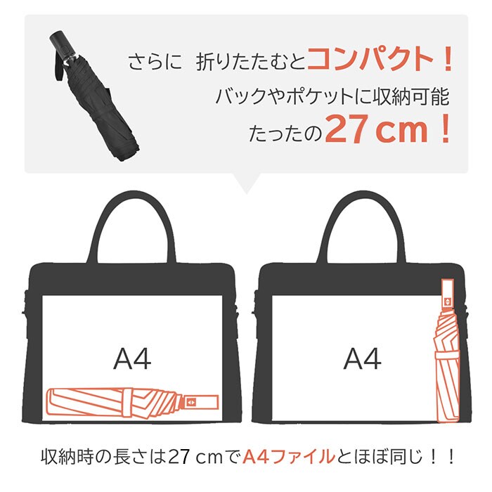 | サイズ | 【本体】 [親骨の長さ]約53cm/[直径]約94cm/[全長]約55cm [収納時の長さ]約27cm [収納時の幅]約4.9cm 【収納ケース】 [縦]約30cm/[横]約8.5cm ※サイズは当店計測の実寸サイズです。実際の商品ならびにメーカー表記サイズとは多少の誤差が生じる場合がございます。あらかじめご了承ください。 |