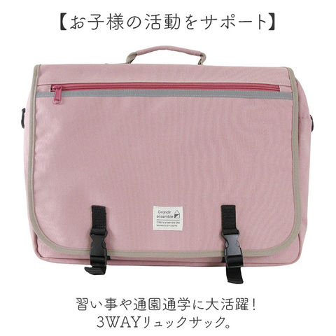 | 商品説明 | 【お子様の活動をサポート】習い事や通園通学に大活躍!3WAYリュックサック。【お好みに合わせて使える】手提げや、ベルトを付け替えてショルダーやリュックにもなる3WAYタイプ!【邪魔にならない】取り外し可能なショルダーベルトと肩ベルトも背ポケットに収納できるから嬉しい!【お子さまに優しいつくり】背面と肩紐はクッション性があり、荷物が多い日でも負担になりにくい〇【開け閉めしやすい】ワンプッシュでラクラク開閉できて中身を取り出しやすい設計。【たっぷり入る収納力】スクエア型なのでA4サイズもすっぽり入り、教科書などもスッキリ収納。【機能的なポケット】内側と外側それぞれに文房具やペットボトルなど、細かい物の収納に便利なポケットが多数搭載。【プライバシーを守る】お名前スペースは内側に配置し、防犯対策にも配慮。【暗い道も安全】表面の反射素材が雨の日や夜間の視認性も高くしてくれて夜道も安心◎【雨の日もOK】撥水加工が施されているから少しの雨なら大丈夫!※完全防水ではありません。 |