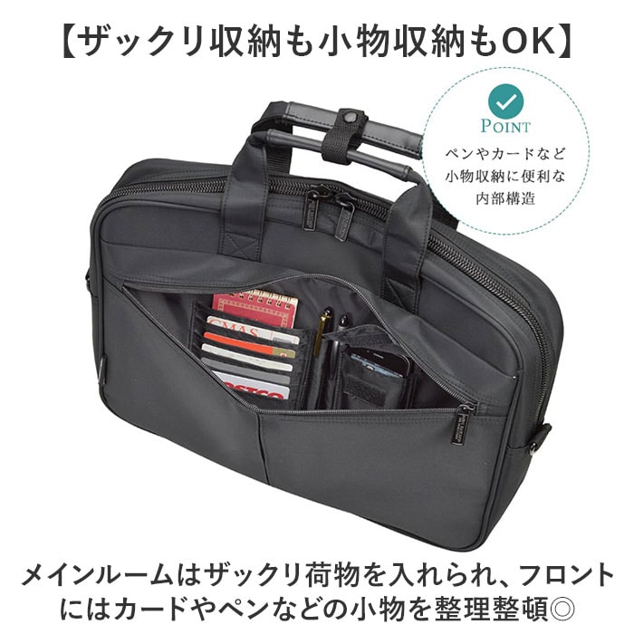 | 商品説明 | 【使いやすさを追求した逸品】収納力が自慢のビジネスバッグ。「ANDY HAWARD ビジネスカジュアル 26525」が登場。【B4ファイルやPCが入るサイズ感】大きめの資料もラクラク収納。クッションINのPCポケットつきで、電子機器の持ち運びも安心。【ザックリ収納も小物収納もOK】メインルームはザックリ荷物を入れられ、フロントにはカードやペンなどの小物を整理整頓◎【シーンに合わせて2WAYチェンジ】取り外し可能のショルダー紐を搭載。ハンズフリーで動きたい時は簡単にチェンジ!【スタイリッシュなオールブラック】他の色を使わない、オールブラック仕様。洗練された大人の雰囲気が魅力。【出張もラクラク♪キャリーオン設計】背面にはループ付。キャリーオンができるので、持ち運びに便利!荷物が多くてもラクラク移動♪【ポケット仕様】メイン後方:PCポケットメイン前方:オープンポケット×1、ファスナーポケット×1フロント:カードポケット×6、ペンポケット×2、フラップポケット×1 |