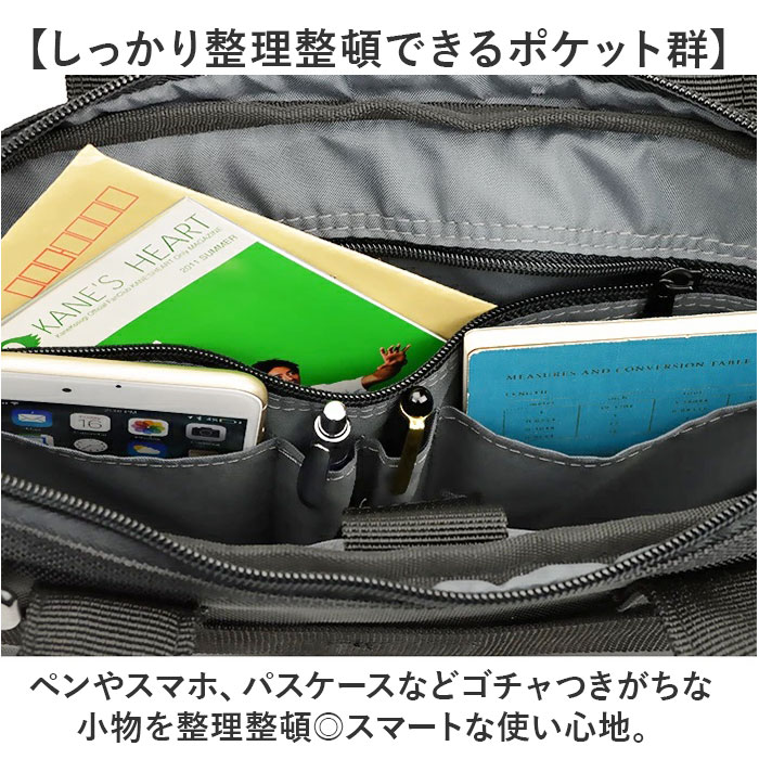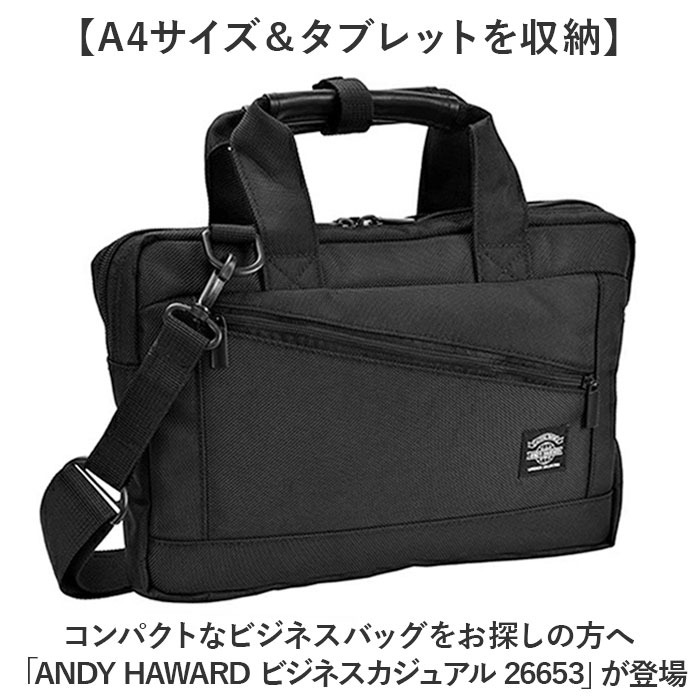 | 商品説明 | 【A4サイズ&タブレットを収納】コンパクトなビジネスバッグをお探しの方へ「ANDY HAWARD ビジネスカジュアル 26653」が登場【小ぶりだけどしっかり収納】A4ファイルやタブレットを収納できるコンパクトサイズ。薄マチスリムがちょうどいい。【身軽に移動!サクサクビジネス】ちょっとの書類とミニPCやタブレットを持ち歩きたい方にぴったりのアイテム☆【しっかり整理整頓できるポケット群】ペンやスマホ、パスケースなどゴチャつきがちな小物を整理整頓◎スマートな使い心地。【シーンに合わせて2WAYチェンジ】取り外し可能のショルダー紐を搭載。ハンズフリーで動きたい時は簡単にチェンジ!【出張もラクラク♪キャリーオン設計】背面にはループ付。キャリーオンができるので、持ち運びに便利!荷物が多くてもラクラク移動♪【ポケット仕様】メイン:PCポケット×1、ファスナーポケット×1、オープンポケット×2、ペンポケット×2フロント:オープンケット×2 |