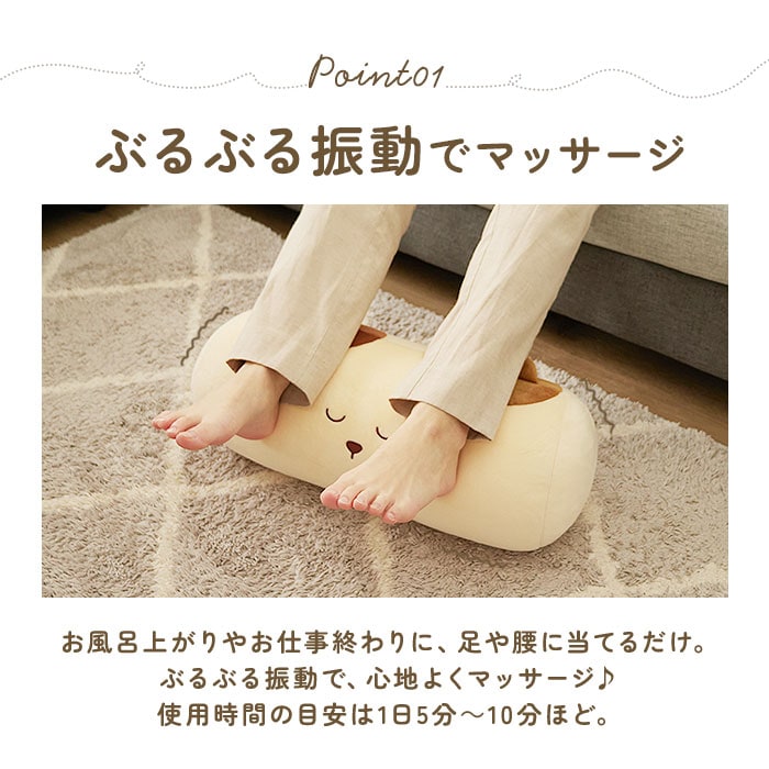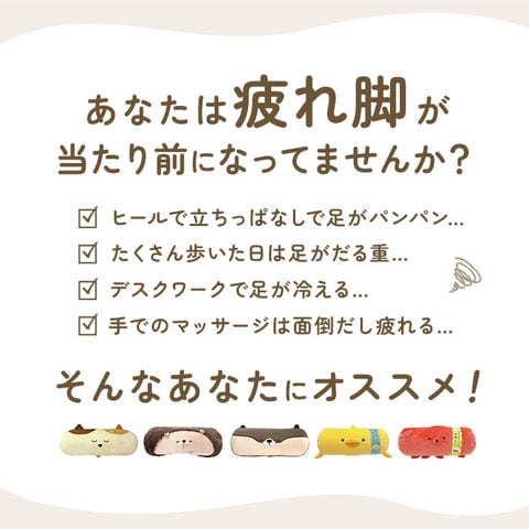 | 商品説明 | お家で足リフレッシュ♪手軽に使える可愛いフットマッサージャー「足ぶるぶるる」が新登場。【リフレッシュタイムにぴったり】お風呂上がりやお仕事終わりに、足や腰に当てるだけ。ぶるぶる振動で、心地よくマッサージ♪使用時間の目安は1日5分~10分。【いつでもどこでも、すぐに使える!】別売りの単3乾電池2本使用。コードレス仕様で場所を選ばず使えるのが嬉しい!【キュートなアニマルデザイン】置いておくだけで心もほっこり。お気に入りの子に癒やされて♪ |