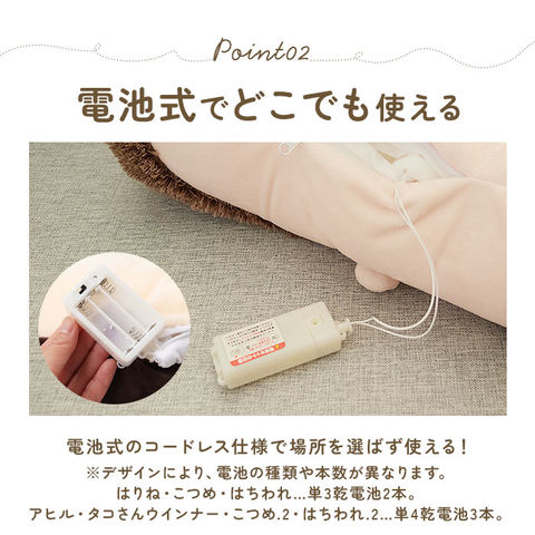 | 素材 | [本体]ポリエステル100% [詰物]発泡ビーズ、わた(ポリエステル100%) [電池ボックス本体基材]ABS樹脂 [振動装置本体基材]ポリプロピレン |