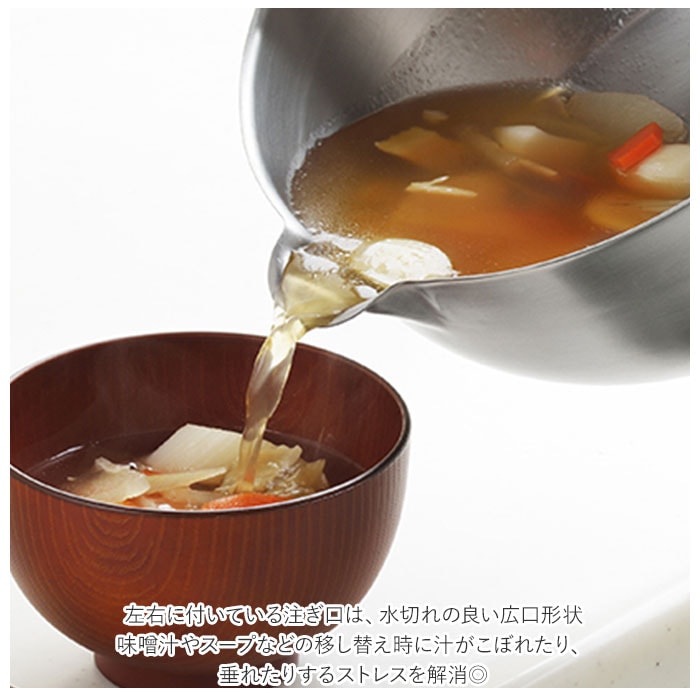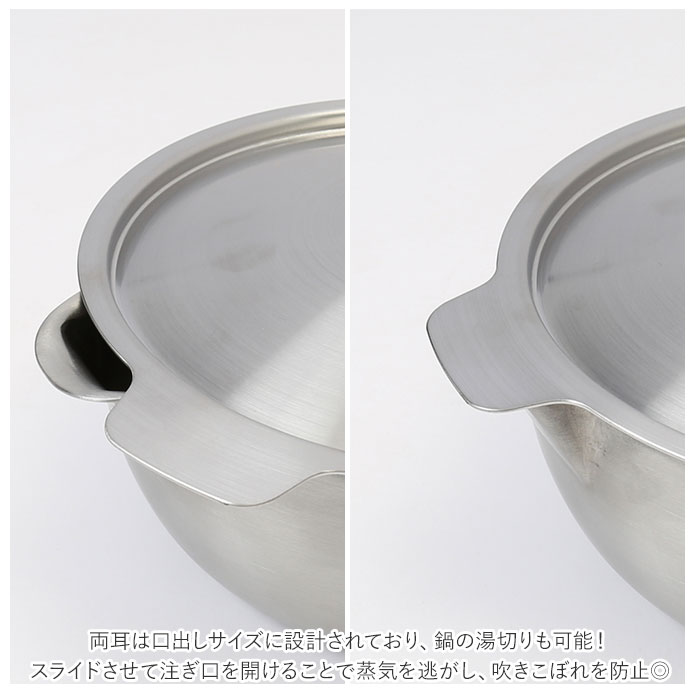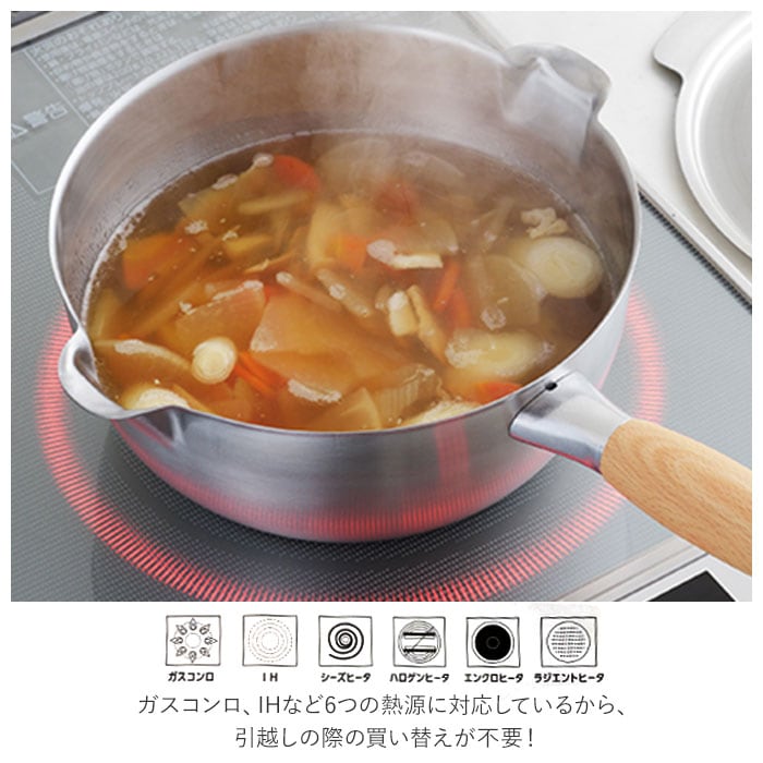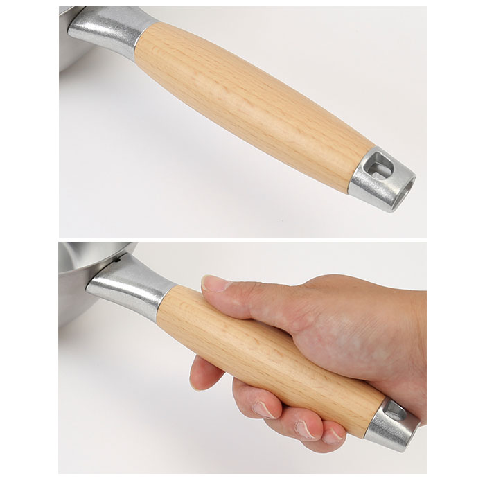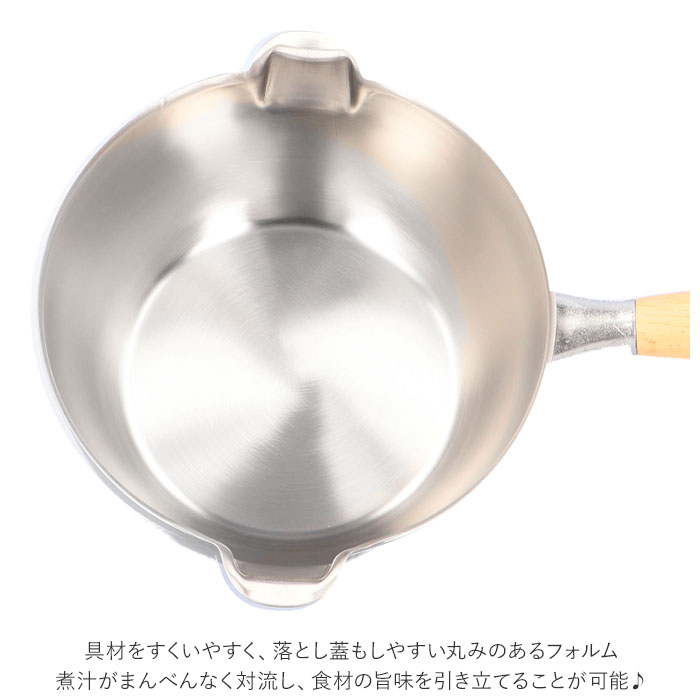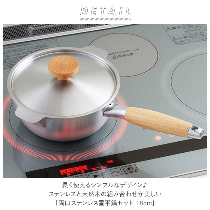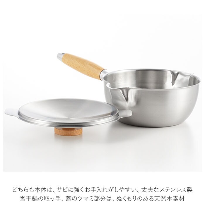 商品説明長く使えるシンプルなデザイン♪ステンレスと天然木の組み合わせが美しい「両口ステンレス雪平鍋セット 18cm」。・「aikata(アイカタ)」は日々の暮らしをより豊かなものにするための道具として立ち上げたブランド。新潟県燕三条の地場の技術を駆使したアイテム。小さすぎず大きすぎない、使い勝手の良い18cmサイズの両口ステンレス雪平鍋と蓋のセット。どちらも本体は、サビに強くお手入れがしやすい、丈夫なステンレス製。雪平鍋の取っ手、蓋のツマミ部分は、ぬくもりのある天然木素材。・【両口ステンレス雪平鍋】満水容量は約1700ml。一般的な「槌目加工」と呼ぼれる模様のない、シンプルでモダンなデザイン。具材をすくいやすく、落とし蓋もしやすい丸みのあるフォルム。煮汁がまんべんなく対流し、食材の旨味を引き立てることが可能♪左右に付いている注ぎ口は、水切れの良い広口形状。味噌汁やスープなどの移し替え時に汁がこぼれたり、垂れたりするストレスを解消◎ガスコンロ、IHなど6つの熱源に対応しているから、引越しの際の買い替えが不要!・【両口ステンレス雪平鍋用蓋】雪平鍋にぴったりフィットするサイズの蓋。両耳は口出しサイズに設計されており、鍋の湯切りも可能!スライドさせて注ぎ口を開けることで蒸気を逃がし、吹きこぼれを防止◎ツマミ部分は安定して置くことができるフラット形状。セットで使えば、毎日のお料理がよりスムーズに♪