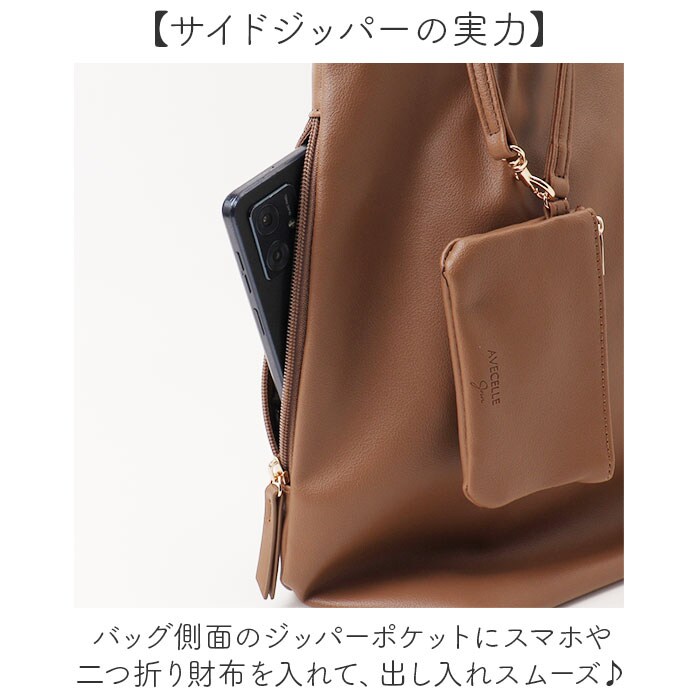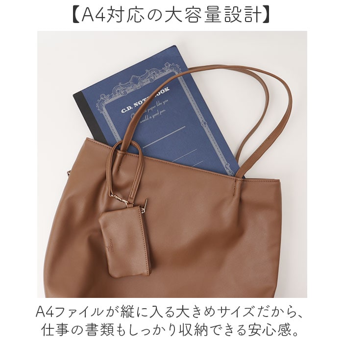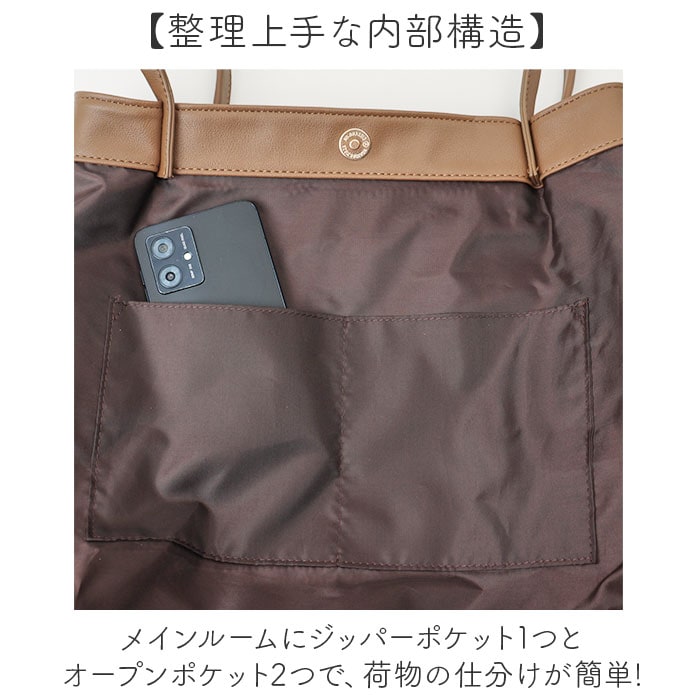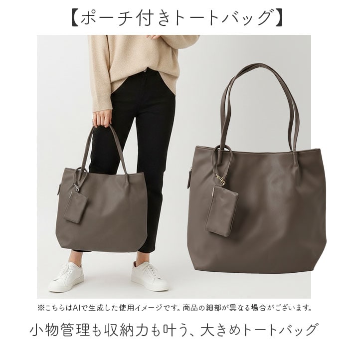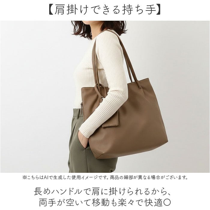 | 商品説明 | 【ポーチ付きトートバッグ】小物管理も収納力も叶う、大きめトートバッグ【便利なポーチつき】持ち手に吊り下げた取り外し可能なポーチで、カギやカードの管理がスマートになる快適さ◎【サイドジッパーの実力】バッグ側面のジッパーポケットにスマホや二つ折り財布を入れて、出し入れスムーズ♪【マグネット開閉】開口部はマグネットボタン式だから、ワンタッチで開け閉めできて便利♪【A4対応の大容量設計】A4ファイルが縦に入る大きめサイズだから、仕事の書類もしっかり収納できる安心感。【内ポケットで整理整頓】ジッパー付きポケットで貴重品を安全に管理でき、オープンポケットで小物も迷子知らず◎【肩掛けできる持ち手】長めハンドルで肩に掛けられるから、両手が空いて移動も楽々で快適〇【整理上手な内部構造】メインルームにジッパーポケット1つとオープンポケット2つで、荷物の仕分けが簡単!【フェイクレザーの上質感】高級感あるフェイクレザー素材だから、きちんと見えて通勤スタイルも格上げできる存在。 |