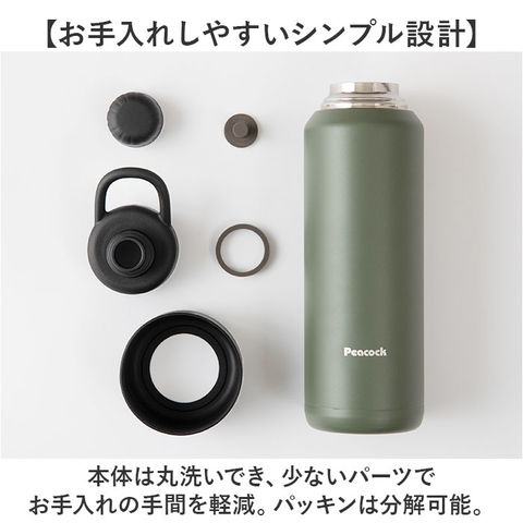 | 商品説明 | 【色んなシーンで使える保冷専用】スポーツドリンク&炭酸に対応◎手軽に持ち歩ける「Peacock ステンレスマグボトル」。【冷たさをキープ!真空2重構造】本体内側と外側が真空断熱された、2重構造タイプ。美味しい温度で、身体もリフレッシュ♪【結露を気にせずどこでも快適】結露で周りを濡らす心配が不要。拭き取る手間なく、ジムや屋外スポーツでも活躍。【塩分に強くスポーツドリンクOK】内瓶には高耐食ステンレス「SUS316」を採用。塩分に強く熱中症対策にもおすすめ。(※)使用後はすぐにお手入れしてください。【炭酸対応!シェアボトルとしても】ボトルの内圧が大きくなると、パッキンから圧力を逃す仕組み。注ぎやすくビール等のシェアも。【ゴクゴク直飲みできて便利】キャップはスムーズに開閉。口当たりも優しく、サッと水分補給。【夏場に重宝する大容量タイプ】たっぷり入る、容量1.2Lサイズ。持ち運びやすい取っ手付き。【ドリンク準備がスムーズ】本体はドリンクを注ぎやすい広口設計。一般的な家庭用製氷機で作った氷もすっぽり。【衝撃から保護するシリコーンカバー】取り外し可能な底面カバー。傷や衝撃から守り、デスクの上に置く際の音を和らげる効果も◎【お手入れしやすいシンプル設計】本体は丸洗いでき、少ないパーツでお手入れの手間を軽減。パッキンは分解可能。【抗菌加工でいつも清潔】キャップ・飲み口せん・パッキンは抗菌加工済み。衛生面も安心。【飽きが来ず長く使える万能アイテム】学生時代から大人になっても愛用!マットな質感で落ち着きのある仕上がり。 |