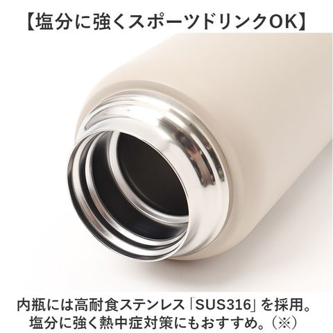 | 素材 | [内びん]ステンレス鋼 [胴部]ステンレス鋼(ポリエステル樹脂塗装) [びん口部]ステンレス鋼 [キャップ]ポリプロピレン [せん]ポリプロピレン [パッキン]シリコーンゴム [底ゴム]シリコーンゴム |