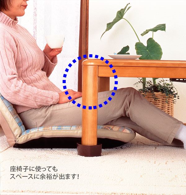 | 商品説明 | こたつの座卓の脚にかぶせるだけで高さがアップします。座椅子を使ってもゆったり座れて、寝転がっても腰があたりません。1段使用で3.5cmアップし、2段使用で7cmアップします。また、テーブルにもお使いいただけます。滑り止めがついているので安心です。 |