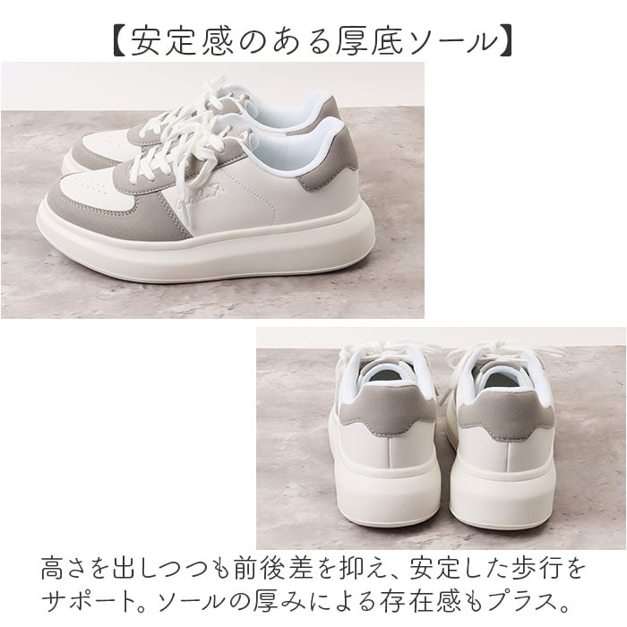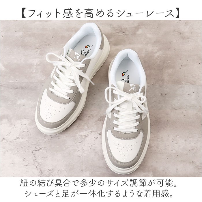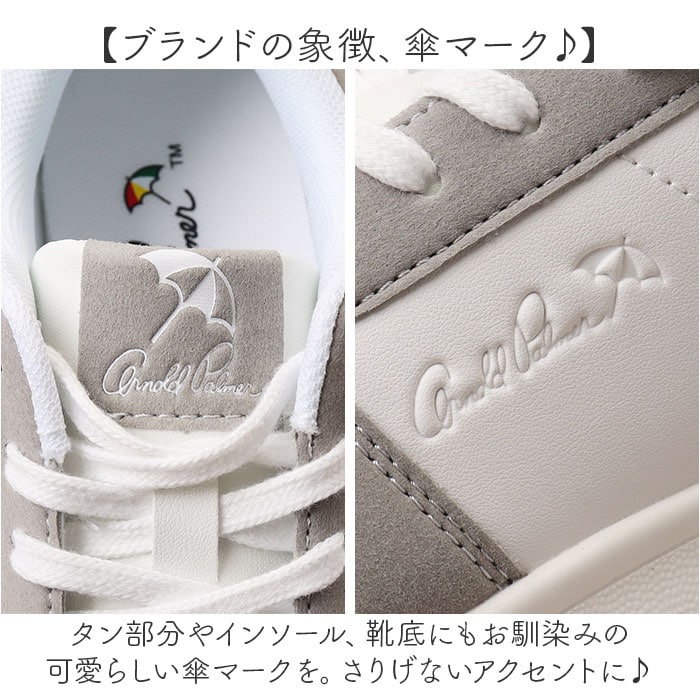 | 商品説明 | 【足元をおしゃれに演出する厚底仕様】自然なスタイルアップが叶い、アクセントにも!Arnold Palmer 厚底スニーカー。【軽やかでストレスフリーな履き心地】重さを感じにくく足さばきがスマート!旅行やレジャーなど、アクティブに動く日にもおすすめ。【フィット感を高めるシューレース】紐の結び具合で多少のサイズ調節が可能。シューズと足が一体化するような着用感。【程よいクッション性で負担を軽減】ふかふかインソールが、足裏を優しく受け止め、衝撃を吸収。長時間歩いても疲れにくい◎【安定感のある厚底ソール】高さを出しつつも前後差を抑え、安定した歩行をサポート。ソールの厚みによる存在感もプラス。【ブランドの象徴、傘マーク♪】タン部分やインソール、靴底にもお馴染みの可愛らしい傘マークを。さりげないアクセントに♪ |