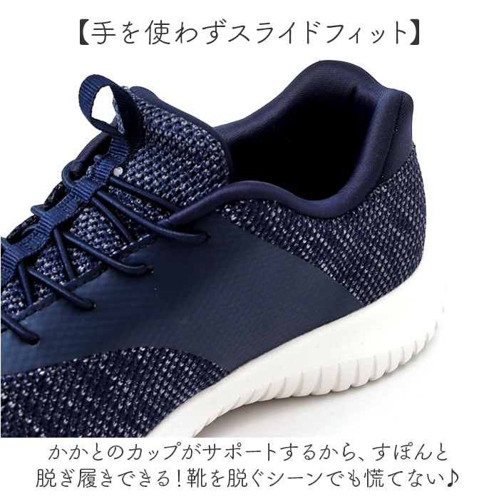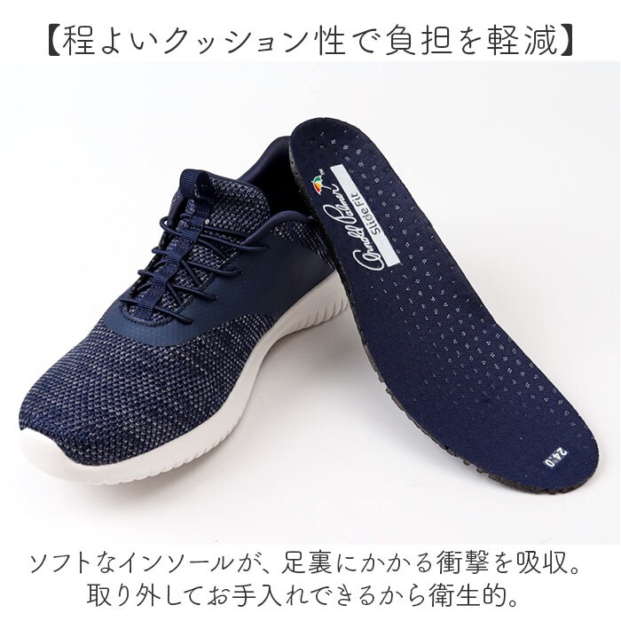 | 商品説明 | 【サッと履けて色んなシーンで活躍】いつでも手ぶらでOK!「Arnold Palmer スライドフィットスニーカー」。【手を使わずスライドフィット】かかとのカップがサポートするから、すぽんと脱ぎ履きできる!靴を脱ぐシーンでも慌てない♪【軽やかでストレスフリーな履き心地】足さばきがスマートな軽量設計。旅行やレジャーなど、アクティブに動く日にもおすすめ。【自分サイズに優しくフィット】柔らかくソフトな肌当たりで、締め付け感ゼロ◎伸縮性のあるゴム紐は結ぶ必要なし。【程よいクッション性で負担を軽減】ソフトなインソールが、足裏にかかる衝撃を吸収。取り外してお手入れできるから衛生的。【屈曲性があり、歩きやすさが向上】つま先部分が足の動きに合わせて柔軟に曲がる、上向き形状。蹴り上げやすくつまずきにくい!【安定感のある歩行をサポート】底面に凹凸加工を施したソール。1歩1歩しっかり進めて、安定性をキープ。【カジュアルなスポーティーデザイン】コーデの外しアイテムとして重宝。落ち着きのあるカラーに、ブランドロゴをON。 |