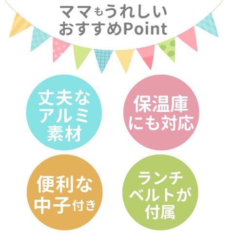 | 注意点 | [付属品]ランチベルト×1、名前シール×1電子レンジ:不可 食洗機:不可 お取り扱いの際は、商品やパッケージなどに記載されている品質表示、アテンションタグ、ご使用上の注意事項などを必ずご確認下さい。本来の目的以外にはご使用にならないで下さい。カメラやモニターの性質により、画像と実物の色の違いがある場合がございますのでご理解願います。 |