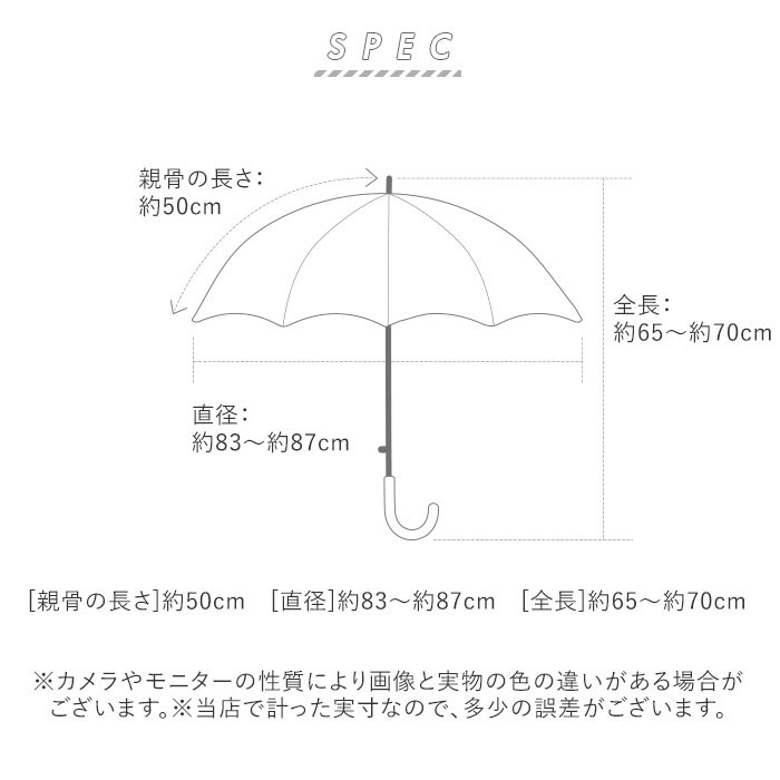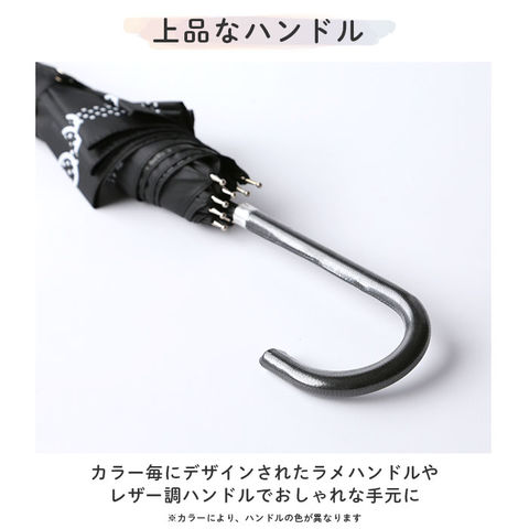 | 注意点 | 製品には尖った部分があります。開閉時には常に周囲の安全を確認して、顔や体から離してご使用ください。コーティング生地の特性上、コーティング面がくっつきやすくなっています。ご使用の際、傘をよく振って生地をほぐしてからゆっくりと開いてください。急に開かれますと破損の原因になります。傘生地は色落ちする場合がありますので十分に乾燥させてから保管してください。濡れたままでの衣類などその他の物への接触はお避けください。(濡れたまま放置したり、生地の表面を擦ると防水・撥水力の低下や骨の劣化に繋がります。)手元、または骨の先端が壊れたまま使用しないでください。振り回したり、投げたりしないでください。台風や強風のときは、破損する恐れがありますので、注意してご使用ください。部品が破損・欠損したまま使用しないでください。ステッキがわりに使用しないでください。高温・直射日光のあたる場所に長時間保管しないでください。お子様には保護者の方からご注意ください。晴れの時には日傘として、急な雨に降られた場合にも使用できる晴雨兼用傘です。雨傘で使用する場合、一般的なにわか雨程度を想定した商品です。激しい雨には使用できませんのでご注意ください。カメラやモニターの性質により、画像と実物の色の違いがある場合がございますのでご理解願います。 |
