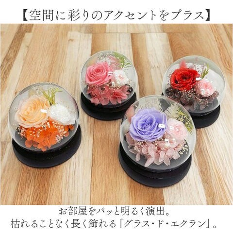 | 商品説明 | 【空間に彩りのアクセントをプラス】お部屋をパッと明るく演出。枯れることなく長く飾れる「グラス・ド・エクラン」。【花々の美しさが引き立つ透明ドーム】透明なガラスドームの中に、繊細なプリザーブドフラワーをアレンジ。美しい状態で楽しめる♪(※1)ガラスのフタは取り外し可能です。【生花のようなプリザーブドフラワー】瑞々しい質感と、上品な色合いが魅力。まるで本物のお花のような、自然な仕上がり。(※2)直射日光や湿気を避け、風通しの良い場所に飾ることで、より長く美しい状態でお楽しみいただけます。【水やり不要でお手入れラクラク】面倒なお手入れは必要なし!長期不在の時も安心、どなたでも気軽にお花を取り入れられる◎【お掃除も手間いらずでノンストレス】ガラスドームに覆われているので、お花がホコリで汚れない!ドームをサッと拭き取るだけ。【ちょっとした贈り物にもぴったり】場所を選ばず飾りやすいサイズ感。想いをプリザーブドフラワーに込めて届けよう♪ |