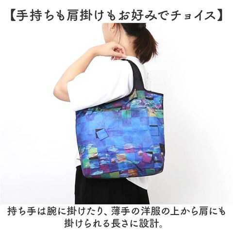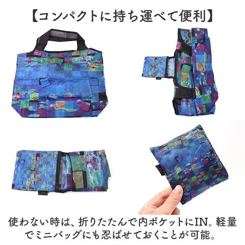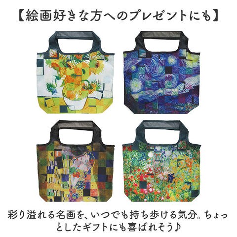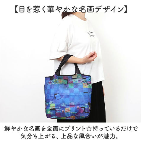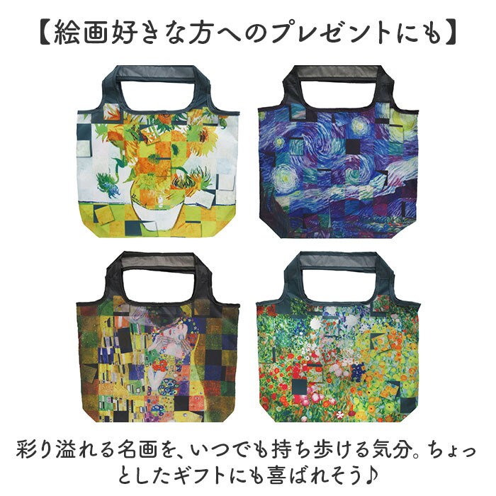 | 商品説明 | 【いつでもお出かけの心強い相棒】折りたたみOK!持っていれば、いざという時に重宝する「名画 エコバッグ Mサイズ」。【目を惹く華やかな名画デザイン】鮮やかな名画を全面にプリント☆持っているだけで気分も上がる、上品な風合いが魅力。【デイリーに使いやすいMサイズ】サッと広げて扱いやすいサイズ感。コンビニでのお買い物など、ちょっと荷物が増えた時に最適。【手持ちも肩掛けもお好みでチョイス】持ち手は腕に掛けたり、薄手の洋服の上から肩にも掛けられる長さに設計。【コンパクトに持ち運べて便利】使わない時は、折りたたんで内ポケットにIN。軽量でミニバッグにも忍ばせておくことが可能。【絵画好きな方へのプレゼントにも】彩り溢れる名画を、いつでも持ち歩ける気分。ちょっとしたギフトにも喜ばれそう♪【ポケット仕様】内側:オープンポケット×1(収納用) |