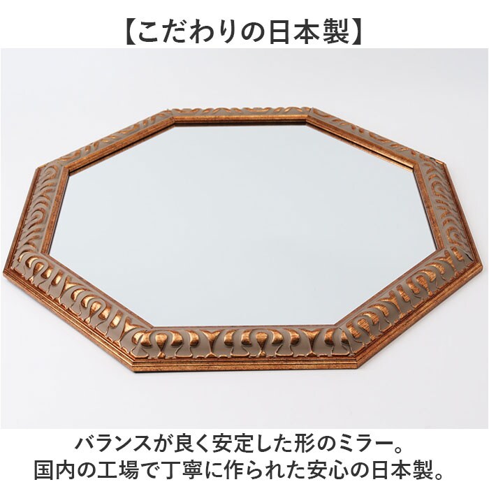 | 商品説明 | 【シンプルな八角形】玄関やトイレに置けるシンプルなデザインの「八角ミラー LLサイズ」が登場。【幸運を引き寄せる八角ミラー】風水の世界で大気中の運をすべてを引き寄せ、悪い気を跳ね返す力があるとされている「八角形」【インテリアに馴染むナチュラル感】温かみがあり自然な風合いの木目調とクラシカルな模様のフレームが上品な雰囲気。【こだわりの日本製】バランスが良く安定した形のミラー。国内の工場で丁寧に作られた安心の日本製。【壁掛けできる吊りヒモ付き】背面に2ヶ所吊り具が付いているので、付属のヒモを通せば壁掛けも可能。(※)掛け金具は付属していません。【使い勝手の良いサイズ感】玄関やトイレにはもちろん、お部屋にも!身だしなみチェックしやすい大きめサイズ。 |