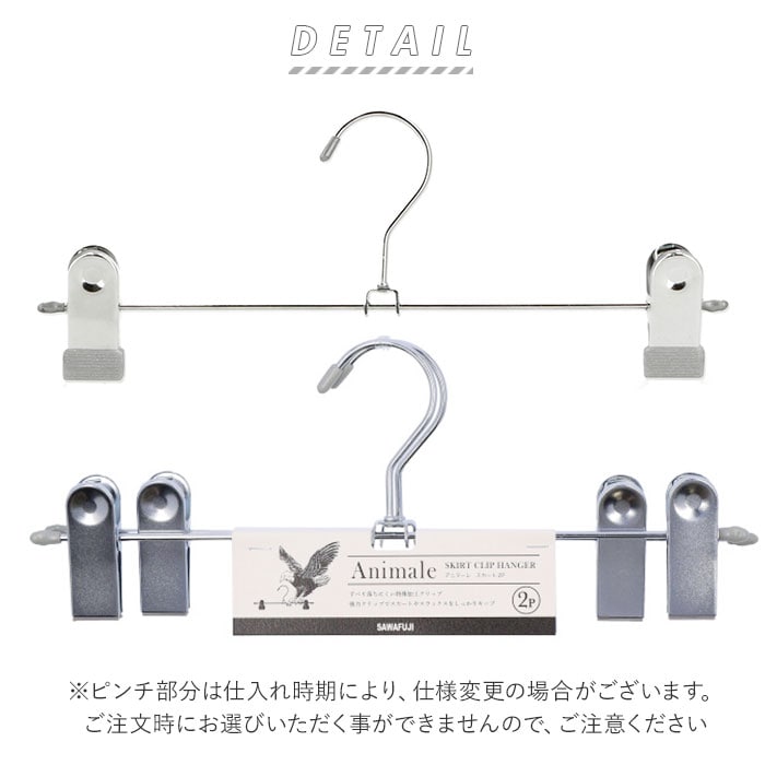 | 商品説明 | スカートやパンツの収納に便利なアニマーレスカートハンガー10本セット。すべり落ちにくい特殊加工クリップが衣類をしっかりと挟む。クリップ部分はスライドして左右に動くので幅の狭いスカートやパンツにも対応。便利な連結フック付きで、クローゼットの中でもスッキリ収納♪余分なスペースをとらない。スカーフマフラーインナーなどの小物類にも◎ |