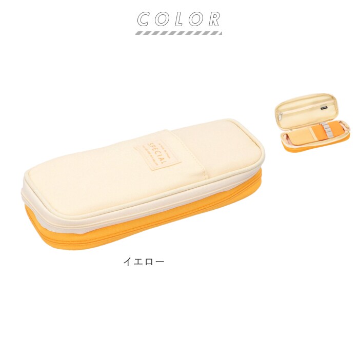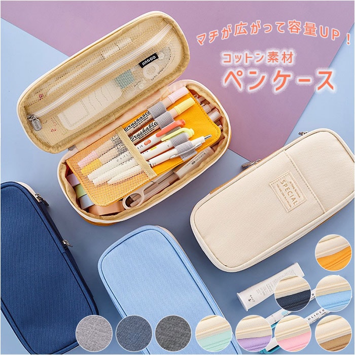 | 商品説明 | 文房具が増えたら、マチが広がって容量UP!ふんわりコットン素材のペンケース♪パカッと開いて収納した小物がひと目でわかる、出し入れが楽ちんなラウンドファスナータイプ。フラップ裏側には、付箋紙や修正テープ、ミニカッターなどバラエティに富んだ小物がしまえるメッシュ式ファスナーポケットを配置。パーティションプレートは使用頻度の高い筆記用具用のペンホルダー。ゴムバンド&メッシュボトムがペンの抜け落ちを防止するので、お気に入りのペンやシャーペンをしっかりホールド。パーティションプレートをめくった裏側はたっぷりしまえるメインスペース。ペンツールはもちろん、ハサミや定規など大きめの文房具もすっぽり♪背面側のファスナーを開放することで、マチ幅が7cm程度にまで拡張する大容量設計で、ペンツールなら最大約90本収納可能!フロントポケットにもペンやクリップ付きのUSBメモリを挿しておくとサッと取り出せて便利。ナチュラルなベージュ色に、鮮やかなパステルカラーを合わせたバイカラーデザイン。ペンケースとしてだけでなく、モバイル小物用ポーチなど使い方は自分次第! |