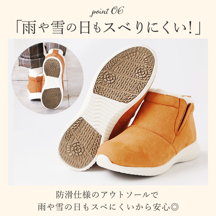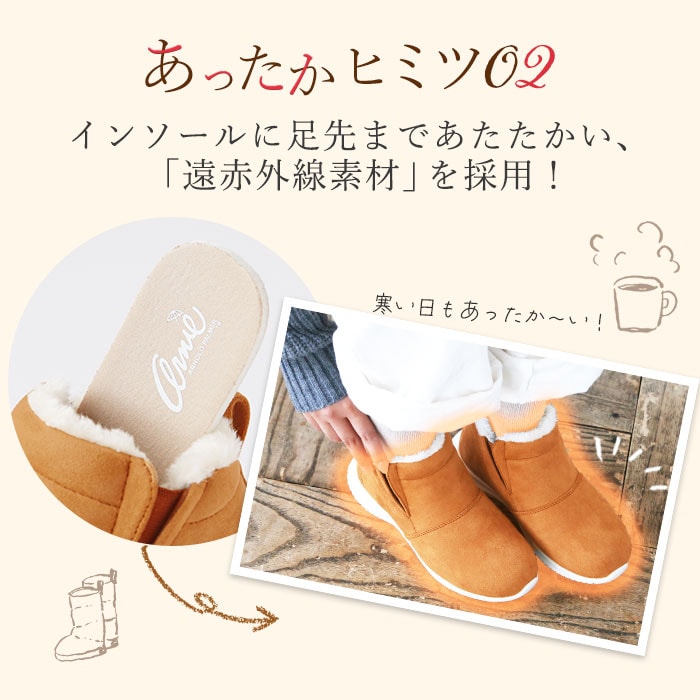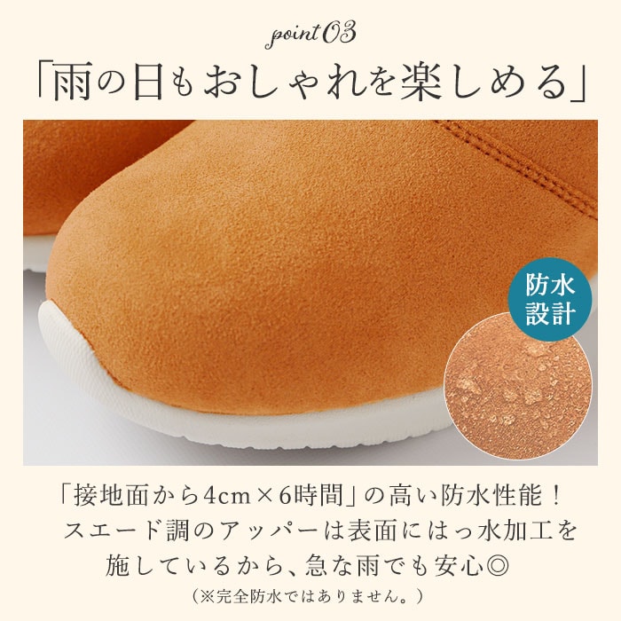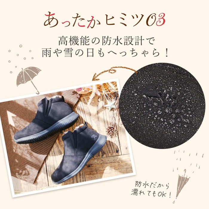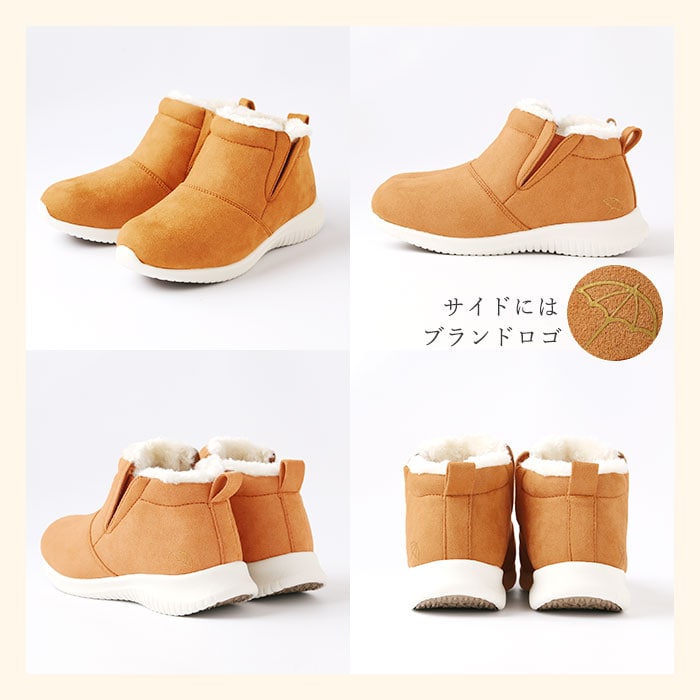 | 商品説明 | 可愛らしい傘マークでおなじみの「Arnie Arnold Palmer」から、雨の日もおしゃれを楽しめるムートン風ブーツが登場。プレッピーさに折々のトレンドの多彩なテイストをミックスさせた、カジュアルフットウェア♪コーディネートしやすい、シンプルなシルエットのブーツ。接地面から4cmまで×6時間の防水設計!(※完全防水ではありません。)アッパー部分(表面)にはっ水加工を施しているから、急な雨でも安心◎インソールに足先まであたたかい、遠赤外線素材を採用!抗菌・防臭機能付き。程よいクッション性もあり、快適な履き心地。防滑仕様のアウトソールで、滑りにくいのもポイント。履き口の両サイドに、伸縮性のあるゴム素材を織り込んだサイドゴア仕様。足入れがスムーズ◎かかとにプルタブ付きで脱ぎ履きがラクチン。雨の日も晴れの日もおしゃれを楽しみたい方にぴったりのアイテム♪ |