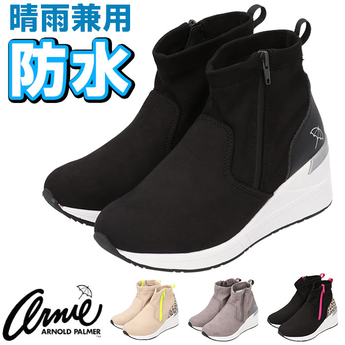 | 商品説明 | 可愛らしい傘マークでおなじみの「Arnie Arnold Palmer」から、雨の日に大活躍のショートブーツが登場。【雨の日も安心】接地面から4cmまで×4時間の防水設計!急な雨にも対応。(※完全防水ではありません。甲上部まで水に浸かると水が侵入する場合があります。)【見た目は普通のショートブーツ!】ハイカットスニーカーのようなスポーティーなデザインで、晴れの日に履いても違和感なし◎天気が不安定な日や、旅行にも!【足入れがスムーズ】外側サイドにジップを装備。履き口が大きく開いて脱ぎ履きラクラク!かかとにはプルタブ付き。【程よいクッション性】低反発インソールが足裏にかかる負担を軽減。長時間履いても疲れにくいのがポイント。【歩きやすさが向上】つま先部分に屈曲性があり、やや上を向いた形状。つまづきにくく蹴り上げやすい!【安定感のあるソール】地面からの衝撃を吸収する高めのソール。程よいヒール設計でスタイルアップを叶えつつ、安定感のある歩行をサポート。【滑りにくく安心】底面は凹凸を施した滑りにくい素材で、濡れた路面でも安全。【防寒対策に】足元を優しく包み込んでくれて、防寒ブーツとしても重宝。【秋冬コーデにマッチ】アッパー部分にしっとりとした質感の素材を使い、落ち着きのある印象に。サイドにキュートな傘マーク付きで、雨の日もおしゃれを楽しみたい女子におすすめ。 |