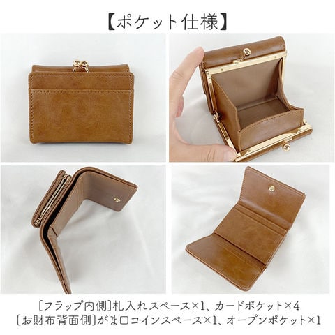 | 商品説明 | 【アニマルのモチーフがキュート☆】手のひらサイズで使いやすい「がま口折り財布」が新登場。【コンパクトな3つ折りタイプ】スナップボタン式のフラップを開くと、3つに折りたためるタイプの札入れスペースが1つ。【キャッシュレス派にも◎】札入れスペース正面に、カードポケットを設け、キャッシュレス派にも嬉しいつくり。【レトロ可愛いがま口スタイル】コインスペースはレトロながま口タイプ。小銭がひと目で確認できるボックスマチ仕上げ。【駅の改札もスムーズに♪】背面側のオープンポケットにICカードを収納しておけば、駅の改札やバス乗車時もワンタッチ!【個性的なモチーフデザイン】柔らかなフェイクレザーを使用。キュートでバラエティに富んだモチーフデザインも魅力。(※)カラーによりモチーフのデザインが異なります。【ポケット仕様】[フラップ内側]札入れスペース×1、カードポケット×4[お財布背面側]がま口コインスペース×1、オープンポケット×1 |