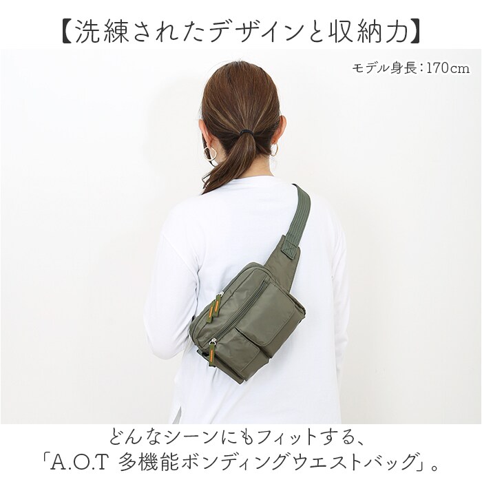 | 商品説明 | 【洗練されたデザインと収納力】どんなシーンにもフィットする、「A.O.T 多機能ボンディングウエストバッグ」。【シンプルで洗練されたデザイン】カジュアルにもオフィスにも馴染む万能アイテム。男女問わずどんなコーディネートにもぴったり。【耐久性に優れたナイロン素材】軽くて丈夫なナイロン素材。日常使いにぴったりな頼れる素材感。【整理整頓して、迷子知らず】内側・外側合わせて6つのポケットを搭載。内側のメッシュポケットは、中身が見えて迷子にならず◎【便利な鍵フック】内側に鍵やキーケースをつないで使えるキーフックを搭載。【両手が空いてストレスフリー】長さ調節OKなショルダーで、肩掛けや斜め掛けに。カチッとアジャスターつきで着脱ラクラク。【ガバっと開くダブルファスナー】左右どちらからもオープン!出し入れしやすく、必要な物がすぐに取り出せて便利!【見た目以上の収納力】コンパクトな見た目以上に、しっかり収納。毎日使いたくなるバッグ。■ポケット■[バッグ前面]ファスナーポケット×1、フラップポケット×2[バッグ背面]ファスナー×1[バッグ内側]:メッシュポケット×1[サイド]オープンポケット×1 |