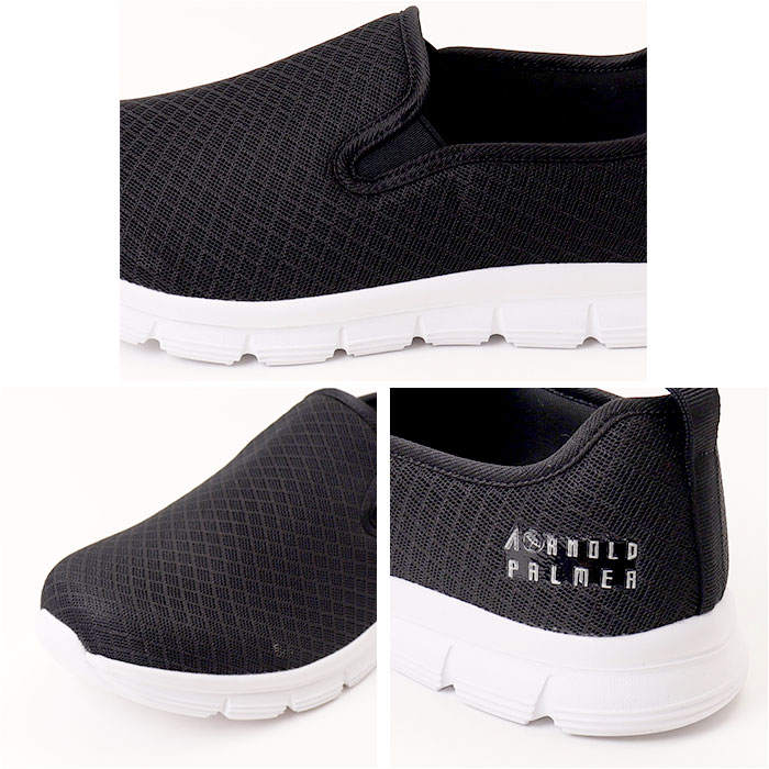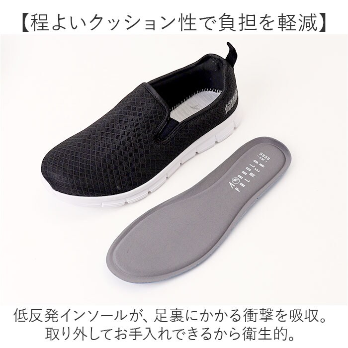 | 商品説明 | 【抜群の履き心地でお出掛けの味方】疲れにくくいつでも快適◎デイリーに活躍するArnold Palmer メンズスニーカー。【軽やかでストレスフリーな履き心地】足さばきがスマートな軽量設計。旅行やレジャーなど、アクティブに動く日にもおすすめ。【靴紐のないスリッポンタイプ】紐を結ぶ手間がなく、滑り込ませるだけ。アッパー両サイドには、伸縮性のあるゴム入り。【程よいクッション性で負担を軽減】低反発インソールが、足裏にかかる衝撃を吸収。取り外してお手入れできるから衛生的。【締め付けのない幅広4Eタイプ】ゆったりとした4E仕様。幅広で靴が窮屈に感じる方におすすめ。【屈曲性があり、歩きやすさが向上】つま先部分が足の動きに合わせて柔軟に曲がる、上向き形状。蹴り上げやすくつまずきにくい!【安定感のある歩行をサポート】底面に凹凸加工を施したソール。1歩1歩しっかり進めて、安定性をキープ。【コーデを選ばないシンプルデザイン】落ち着きのある色合いで、コーデに馴染む◎サイドのブランドロゴが、さりげないアクセント。 |