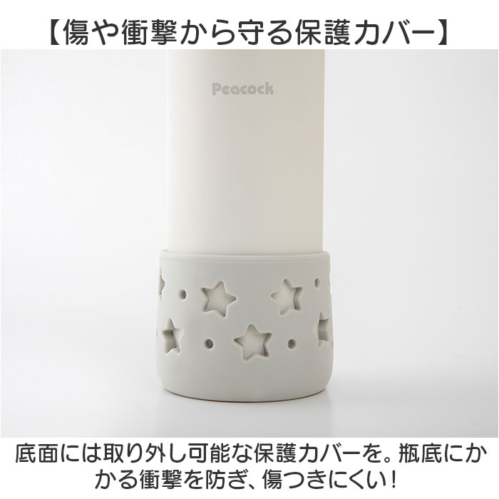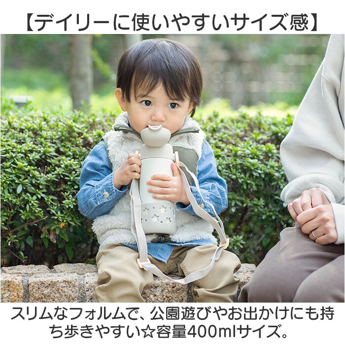 | 商品説明 | 【1歳頃から使える保冷専用ボトル】安心機能付きで、使い勝手抜群◎「Peacock ベビーストローボトル ベルト付き」。【冷たさをキープ!真空2重構造】本体内側と外側が真空断熱された、ステンレスの魔法瓶構造!外出先でも、長時間温度をキープ。【片手で簡単ワンタッチオープン】開閉ボタンを押すだけで簡単に開き、ゴクゴク水分補給できる!【持ち運びも安心のロックリング】開閉ボタン部分にロックリングを装備。万が一の漏れを防止し、カバンの中に入れても大丈夫◎【お子さま1人で飲めるストロー】シリコーン製のストロー付き。柔らか素材で飲みやすく、ストロー飲みの練習にも。【デイリーに使いやすいサイズ感】スリムなフォルムで、公園遊びやお出かけにも持ち歩きやすい☆容量400mlサイズ。【食洗機対応でお手入れカンタン】パーツは分解OK&全パーツ食洗機使用可能。お手入れしやすく、忙しい毎日の味方☆【傷や衝撃から守る保護カバー】底面には取り外し可能な保護カバーを。瓶底にかかる衝撃を防ぎ、傷つきにくい!【持ち運びに便利なショルダーベルト】長さ調節できるショルダーベルト。肩に掛けたり、ベビーカーに引っかけてお出かけ☆【可愛らしいナチュラルデザイン】温かみのあるカラーに、星の型抜きがアクセントになった保護カバー。贈り物にもおすすめ。 |