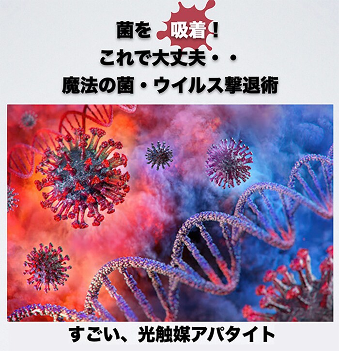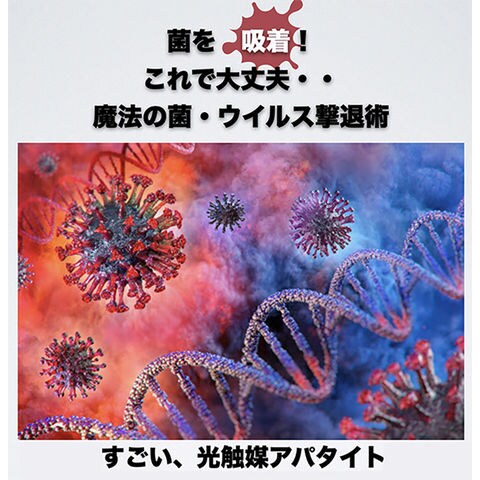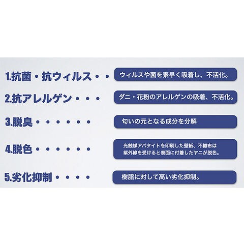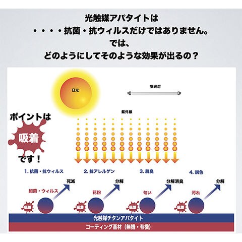 | 注意点 | 表面の粒々が光触媒の粉末ですので強く擦ったり、傷つけないようにご注意ください。汚れた時は軽く水拭きしてください。時々、太陽の光や室内灯の光に当てていただくとウィルス除去効果は長く継続します。 |