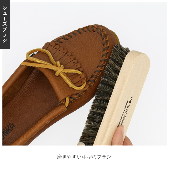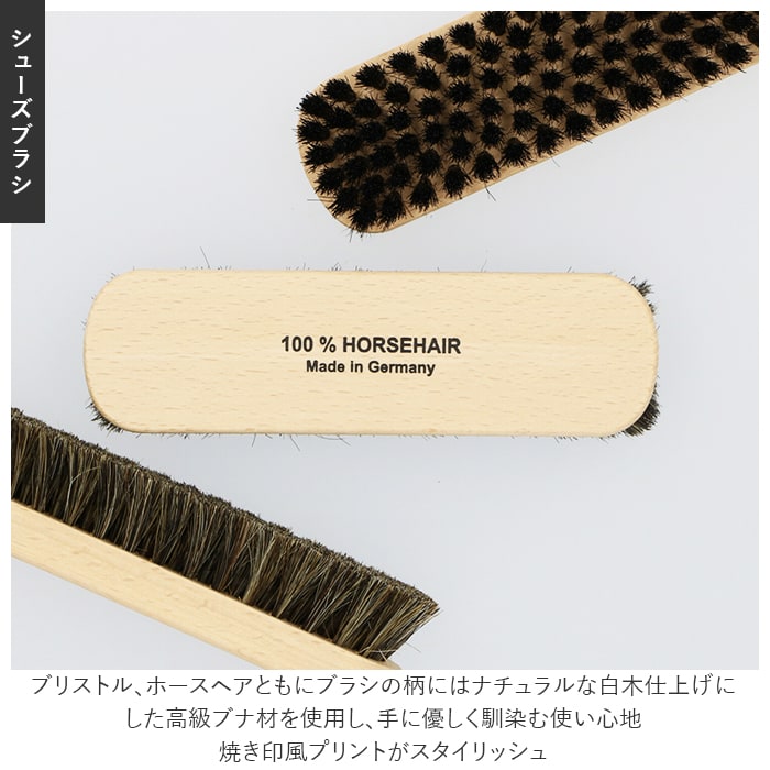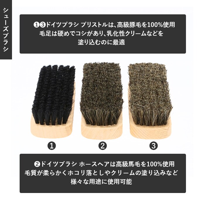 商品説明ドイツブラシ ブリストル白&黒各1つ、ドイツ ブラシホースヘア1つ、グローブタイプのシューシャインクロスの4点セット!ドイツブラシ ブリストルは、高級豚毛を100%使用した磨きやすい中型のブラシ。毛足は硬めでコシがあり、乳化性クリームなどを塗り込むのに最適。ブリストルには白と黒、2種類のカラーがあり、黒いブラシは黒い靴用、白のブラシはその他の色の靴用といった風に使い分けが出来て便利。ドイツブラシ ホースヘアは高級馬毛を100%使用。毛質が柔らかくホコリ落としやクリームの塗り込みなど様々な用途に使用可能。ブリストル、ホースヘアともにブラシの柄にはナチュラルな白木仕上げにした高級ブナ材を使用し、手に優しく馴染む使い心地。「PURE BRISTLES」「100% HORSEHAIR」の焼き印風プリントがスタイリッシュ。シューシャインクロスはクロスの中に手を挿しこんで使用するグローブタイプ!靴磨きクリームや汚れに直接触れずに作業できるので、手が汚れず素早く作業できる。ブリストルブラシ等での汚れ落とし、靴クリームを塗り込みケアした後、靴磨きの仕上げに最適!