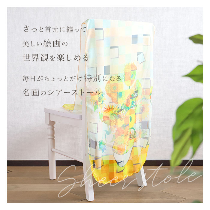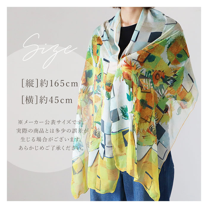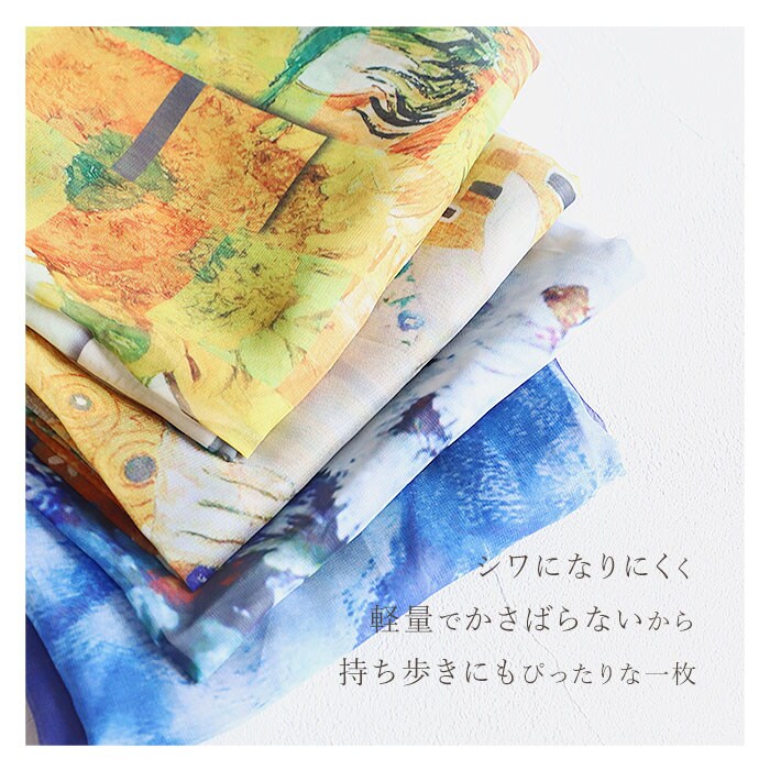 | 商品説明 | 【いつものコーデにアクセントを】シンプルなコーデに映える、優雅な風合いが魅力◎マルチに使える「名画ストール」。【目を惹く華やかな名画デザイン】薄くて透け感のある素材に名画をプリント。独特の色彩が、色んなファッションに素敵にマッチ♪【オールシーズン使える万能アイテム】風を通さず、冬はマフラーや肩掛けに。夏は紫外線やエアコン対策にぴったり。【軽やかで持ち歩きにも便利】シワになりにくく、軽量でかさばらない!カバンに忍ばせて、お出かけや通勤、旅行の相棒に。【絵画好きな方へのプレゼントにも】彩り溢れる名画を、いつでも持ち歩ける気分。ちょっとしたギフトにも喜ばれそう♪ |